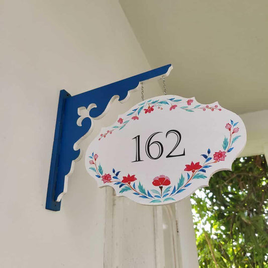 Hand-painted Hanging Name Plate - Navy Victorian Red Flowers