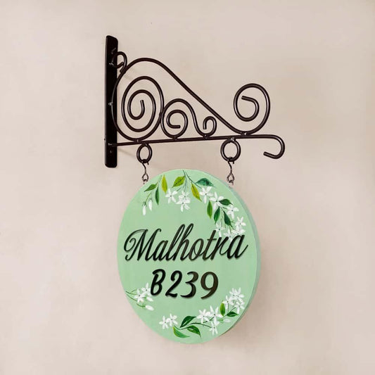 Hand-painted Hanging Name Plate - Green Oval White Red Flowers