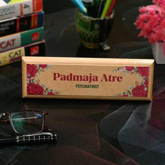Each nameplate in this collection is custom printed with your name and title in a font and colour of your choice. The graphics and text are printed in high-quality colour on the surface of the nameplate, creating a sharp and vibrant contrast with the wood. The nameplate also comes with a brass stud at the back that allows you to display it on your table with ease.