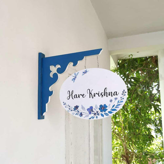 Hand-painted Hanging Name Plate - Navy Oval White Blue Flowers