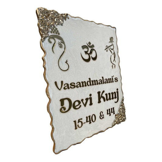 Vasandmalani's - Ganesha & Krishna Pearl White Swirl Resin Nameplate