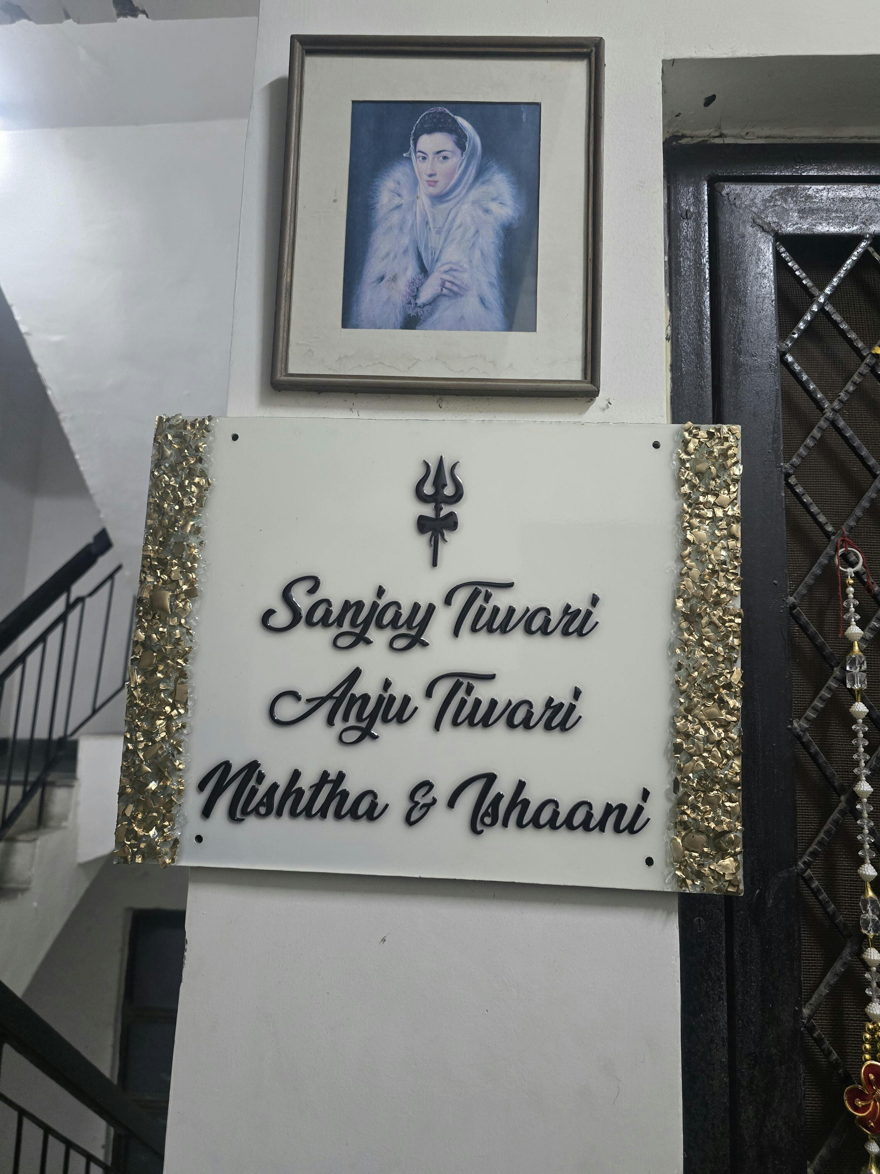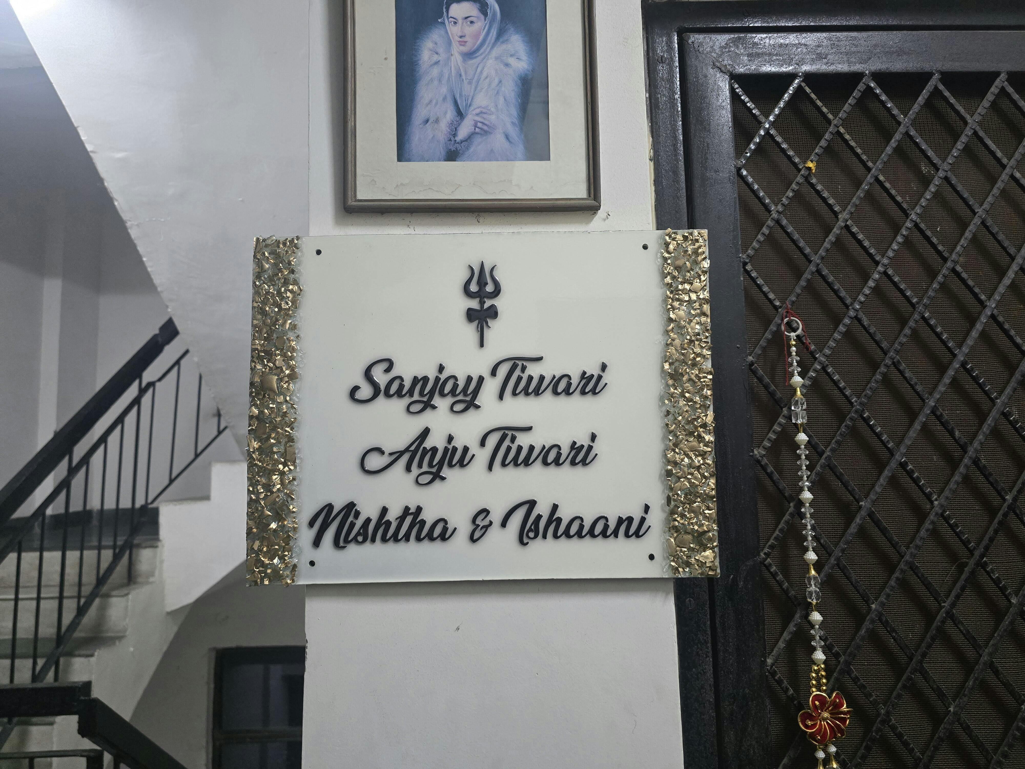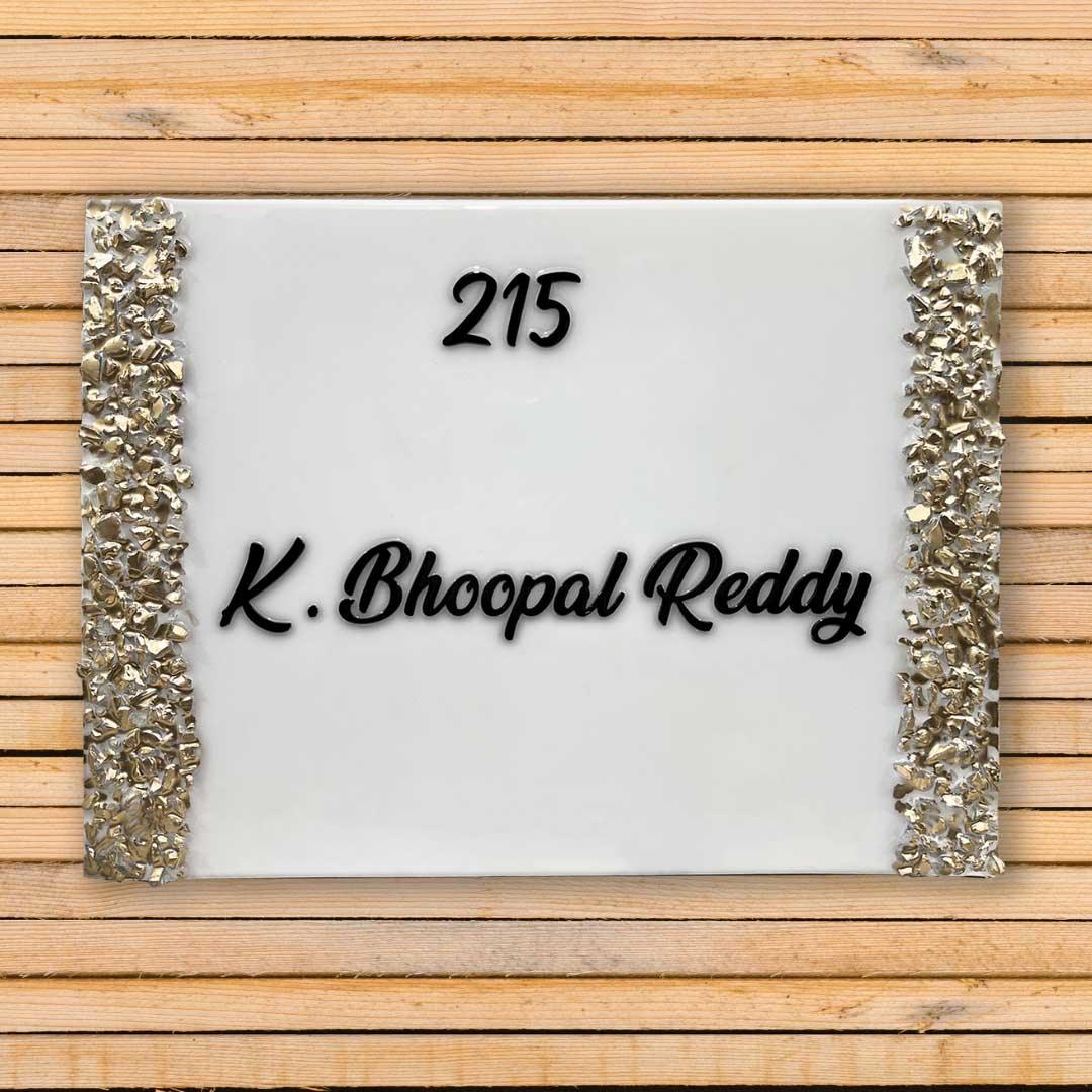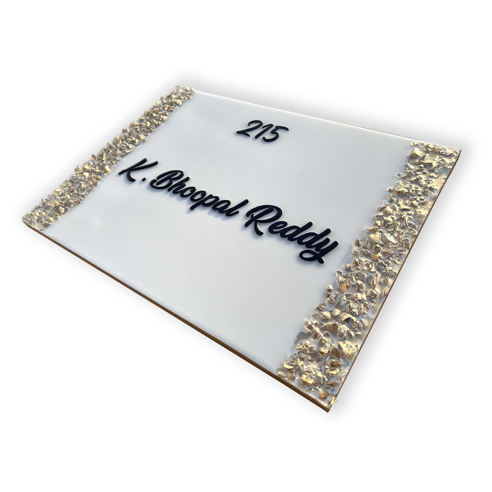 The Bhoopal Reddy - White and Gold Crystal Resin Nameplate offers a refined and elegant welcome to your home. Handcrafted with premium epoxy resin, this rectangular nameplate features a luminous white base adorned with sparkling golden crystals, all finished with a high-gloss sheen. Here are its salient features: