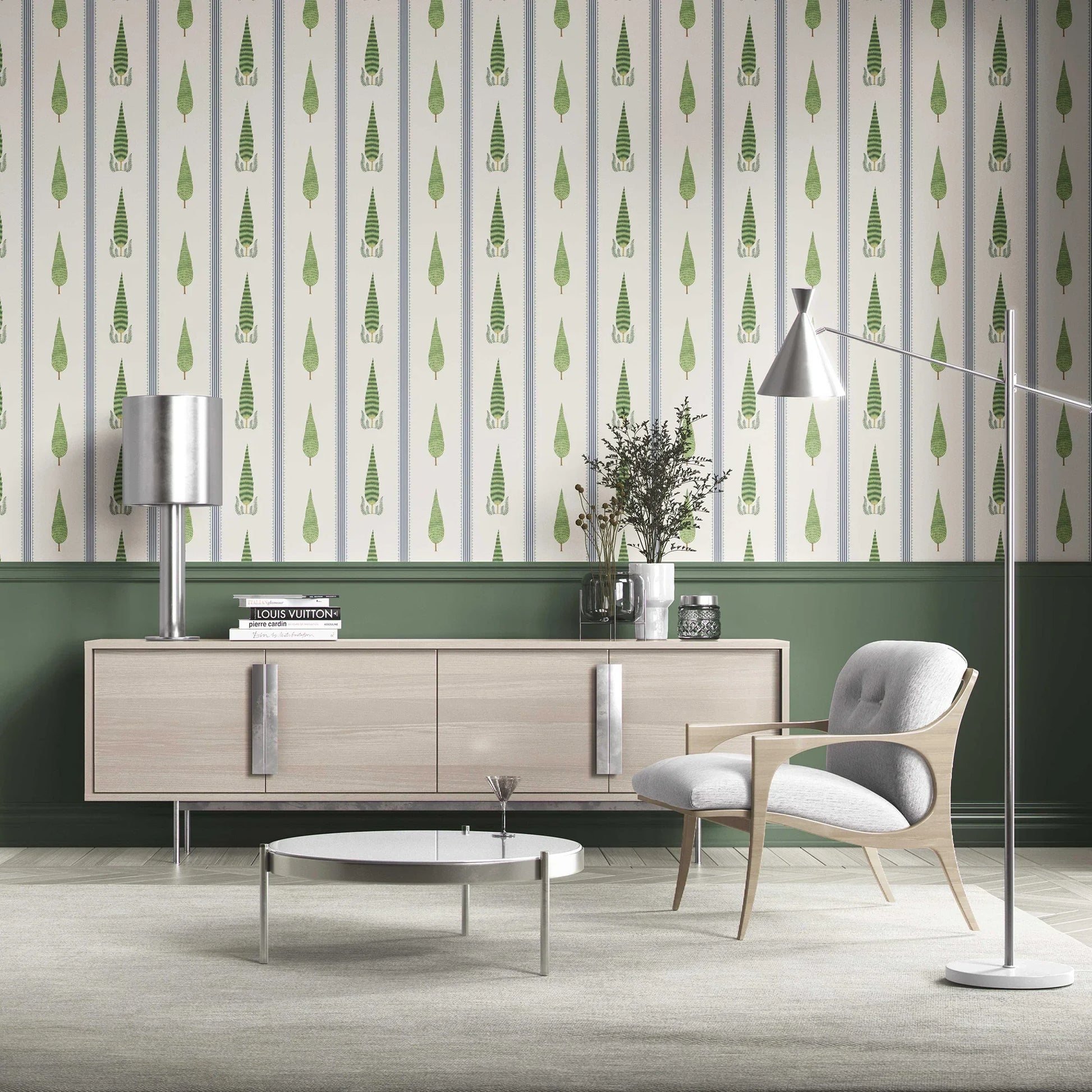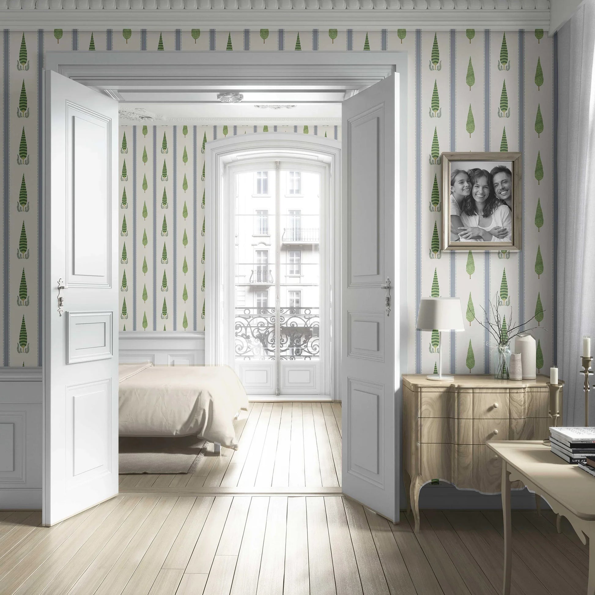 Inspired by the timeless elegance of palace gardens and the architectural grace of Mughal courtyards, the Deodar Wallpaper brings a touch of regal serenity into your home. The upright tree motifs, framed with hand-drawn borders, echo the tall and slender deodar cedars of the Himalayas — symbols of strength, calm, and endurance.