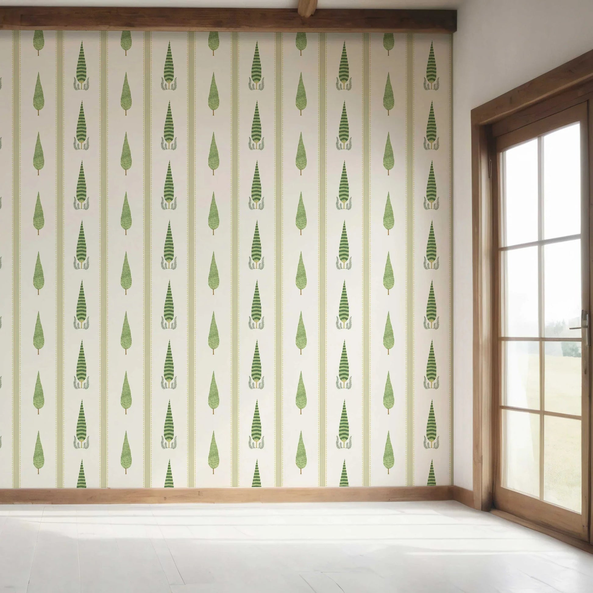 Inspired by the timeless elegance of palace gardens and the architectural grace of Mughal courtyards, the Deodar Wallpaper brings a touch of regal serenity into your home. The upright tree motifs, framed with hand-drawn borders, echo the tall and slender deodar cedars of the Himalayas — symbols of strength, calm, and endurance.