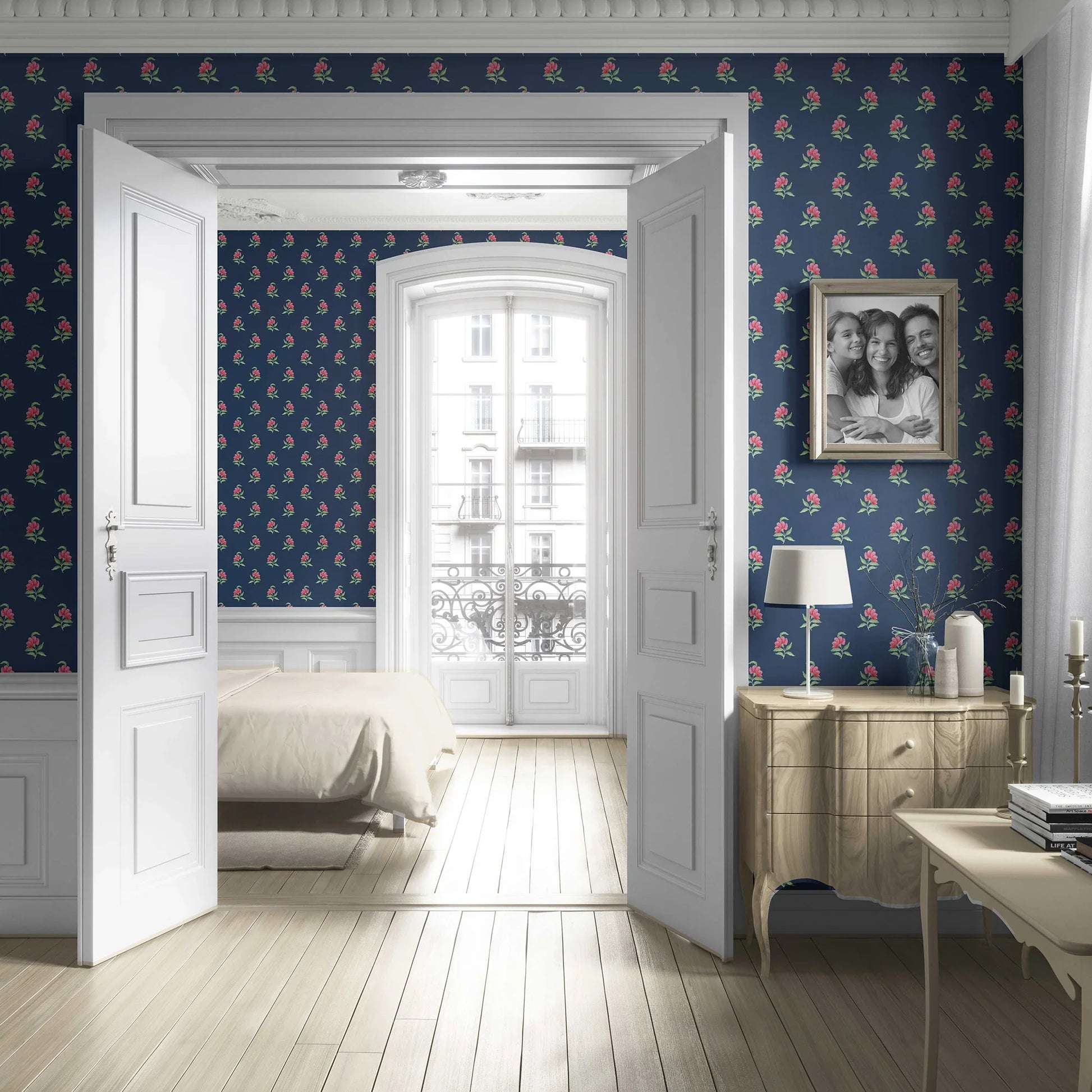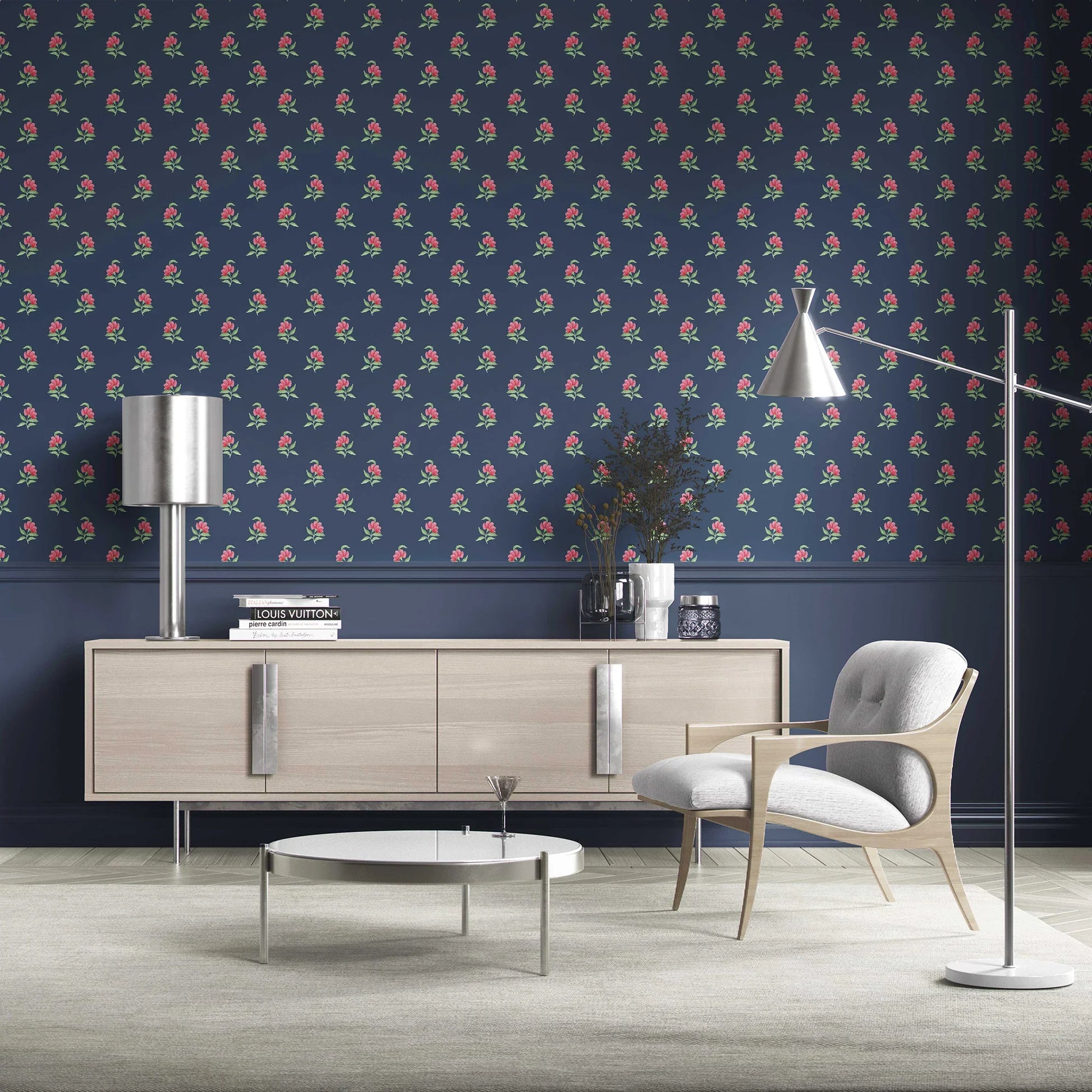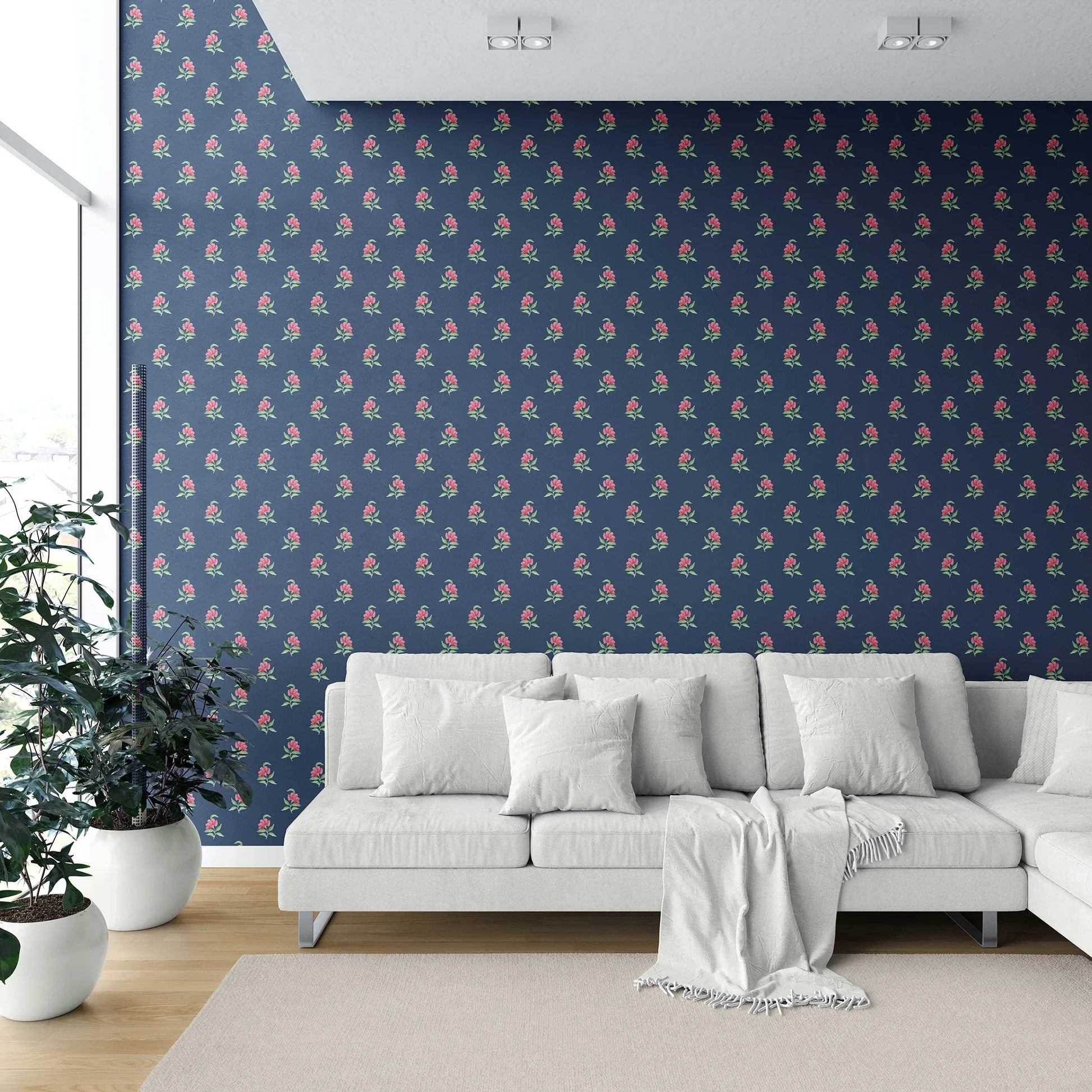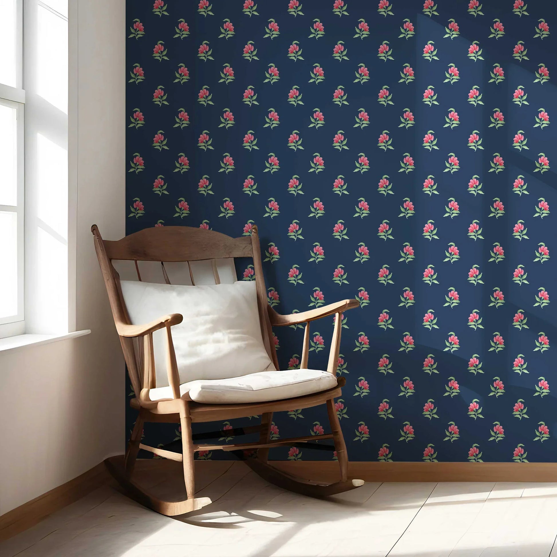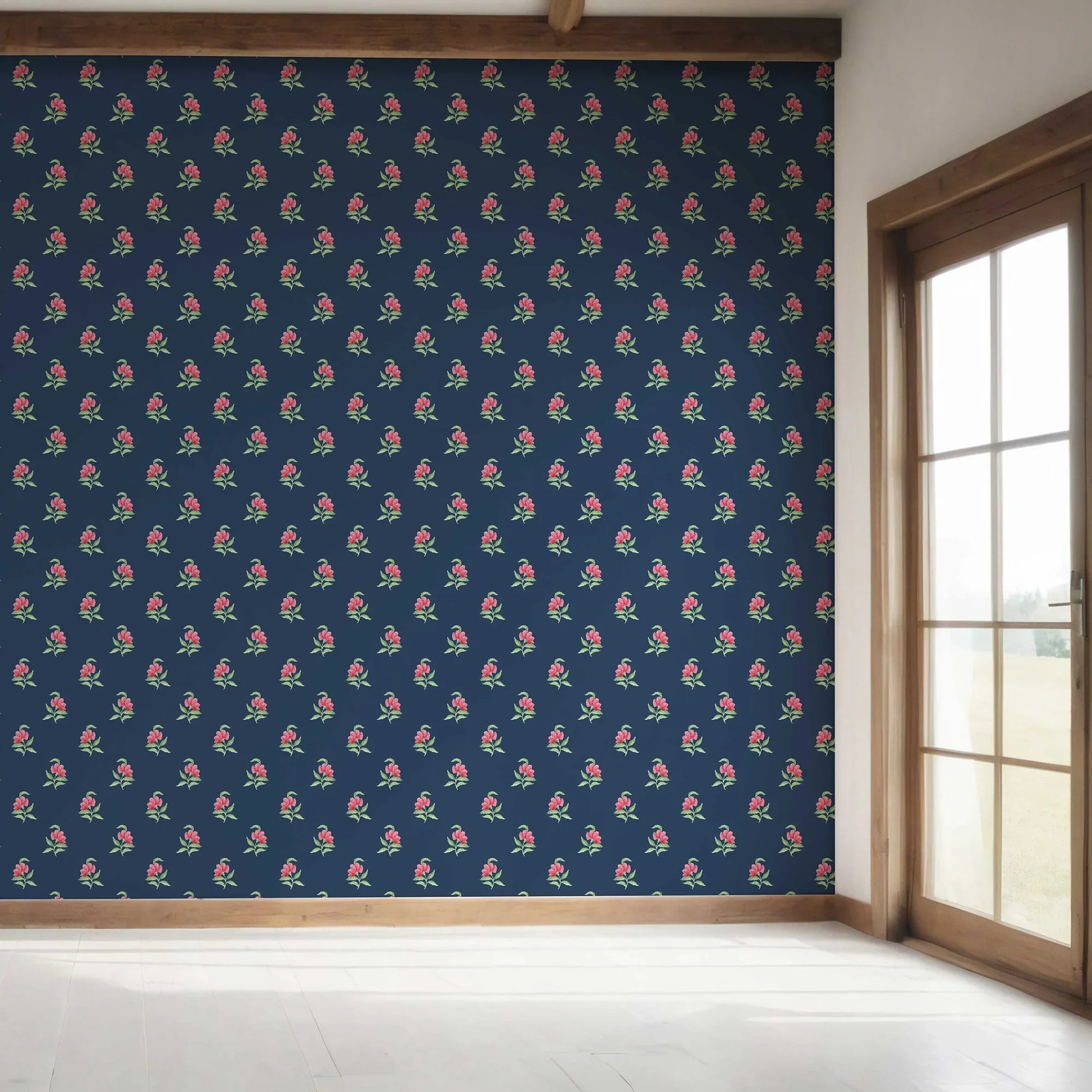 Perfect for creating a serene yet vibrant atmosphere, this wallpaper works beautifully in living rooms, bedrooms, dining spaces, or even boutique interiors. Its evenly spaced floral motifs bring balance to the design, while the subtle background shades offer versatility for pairing with various décor styles — from traditional Indian settings to modern minimalist spaces.
