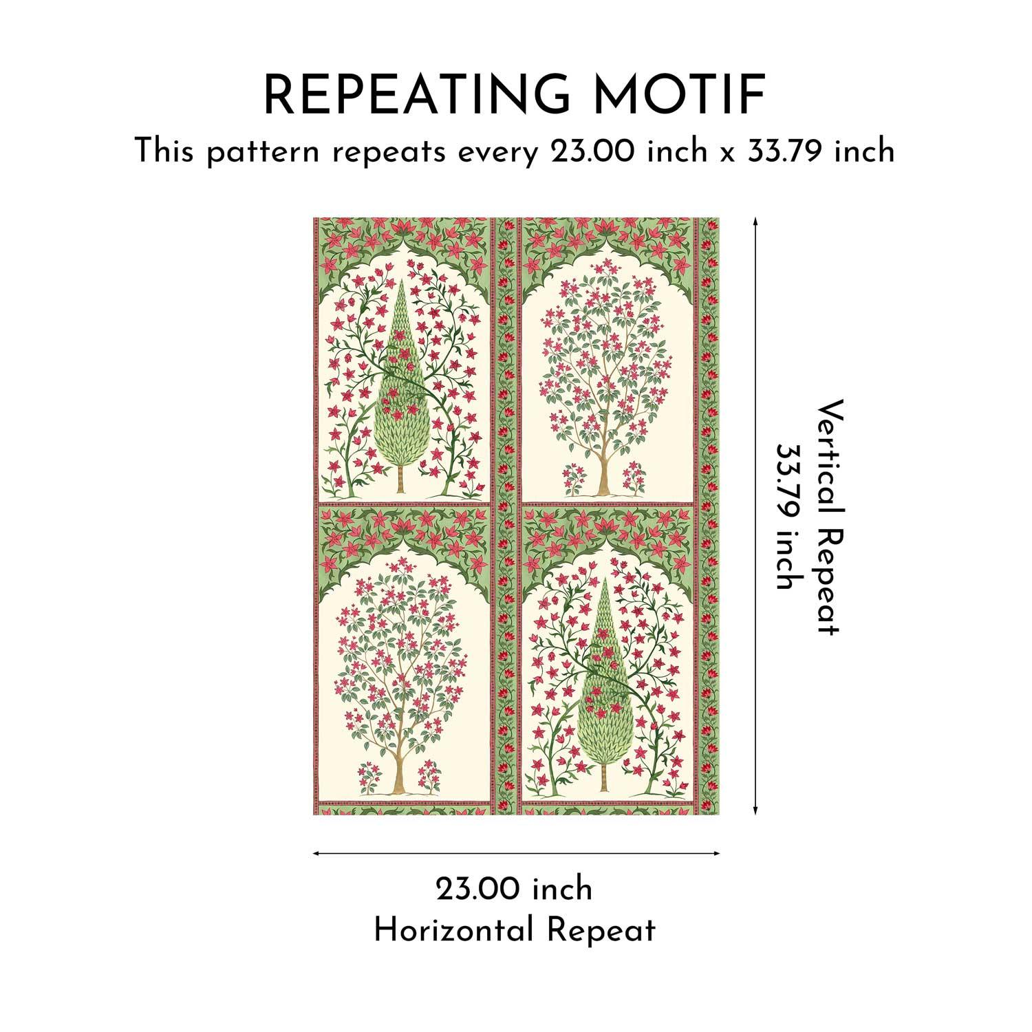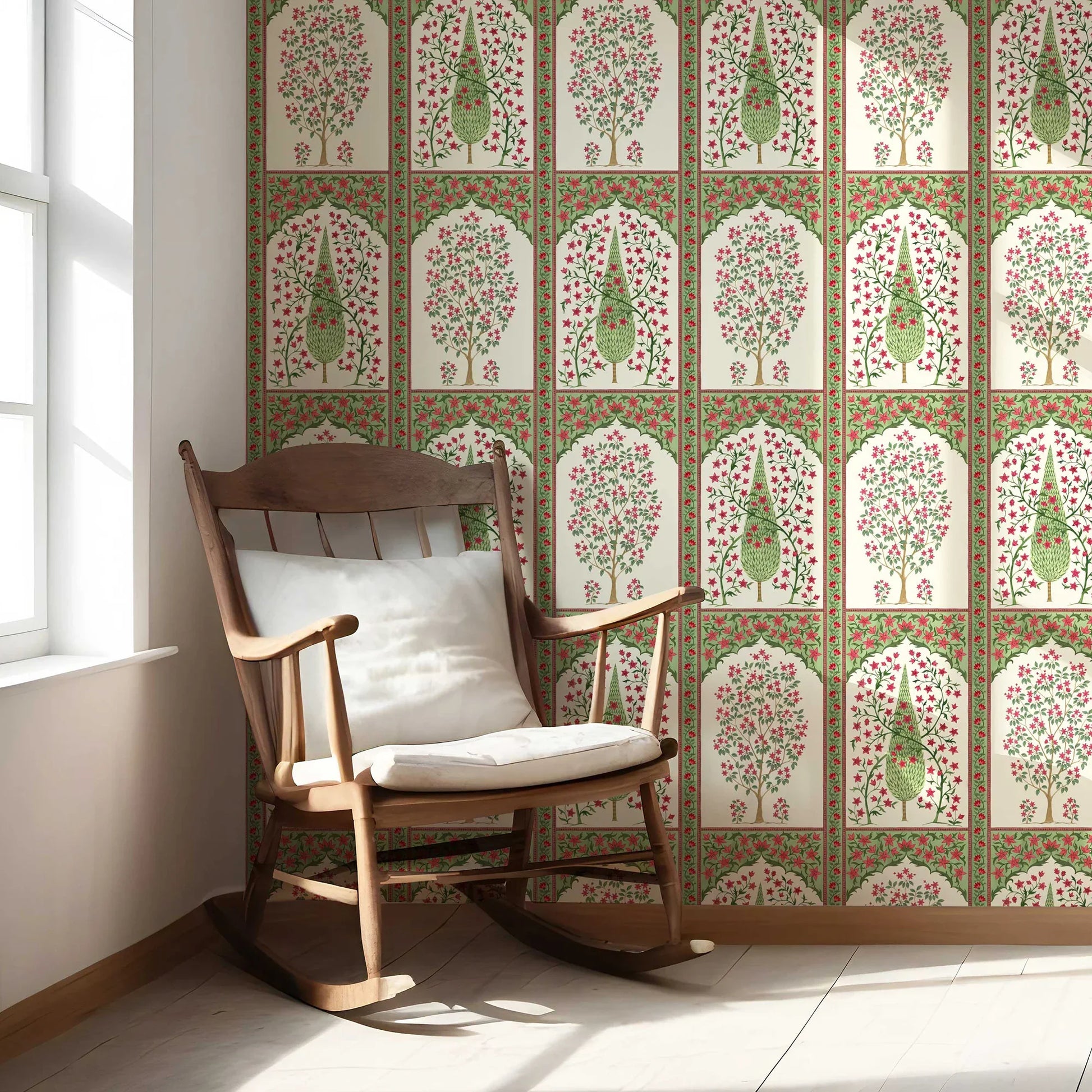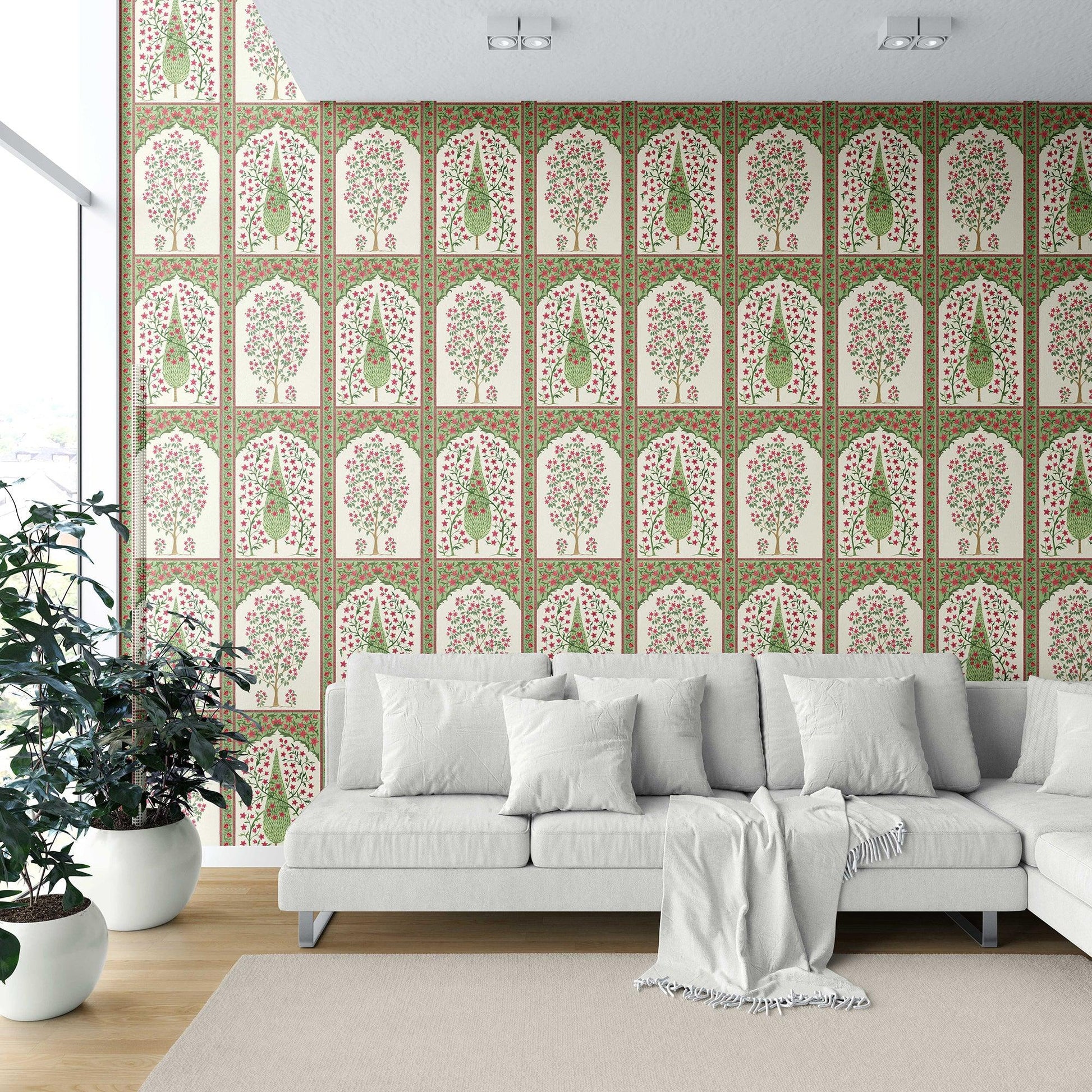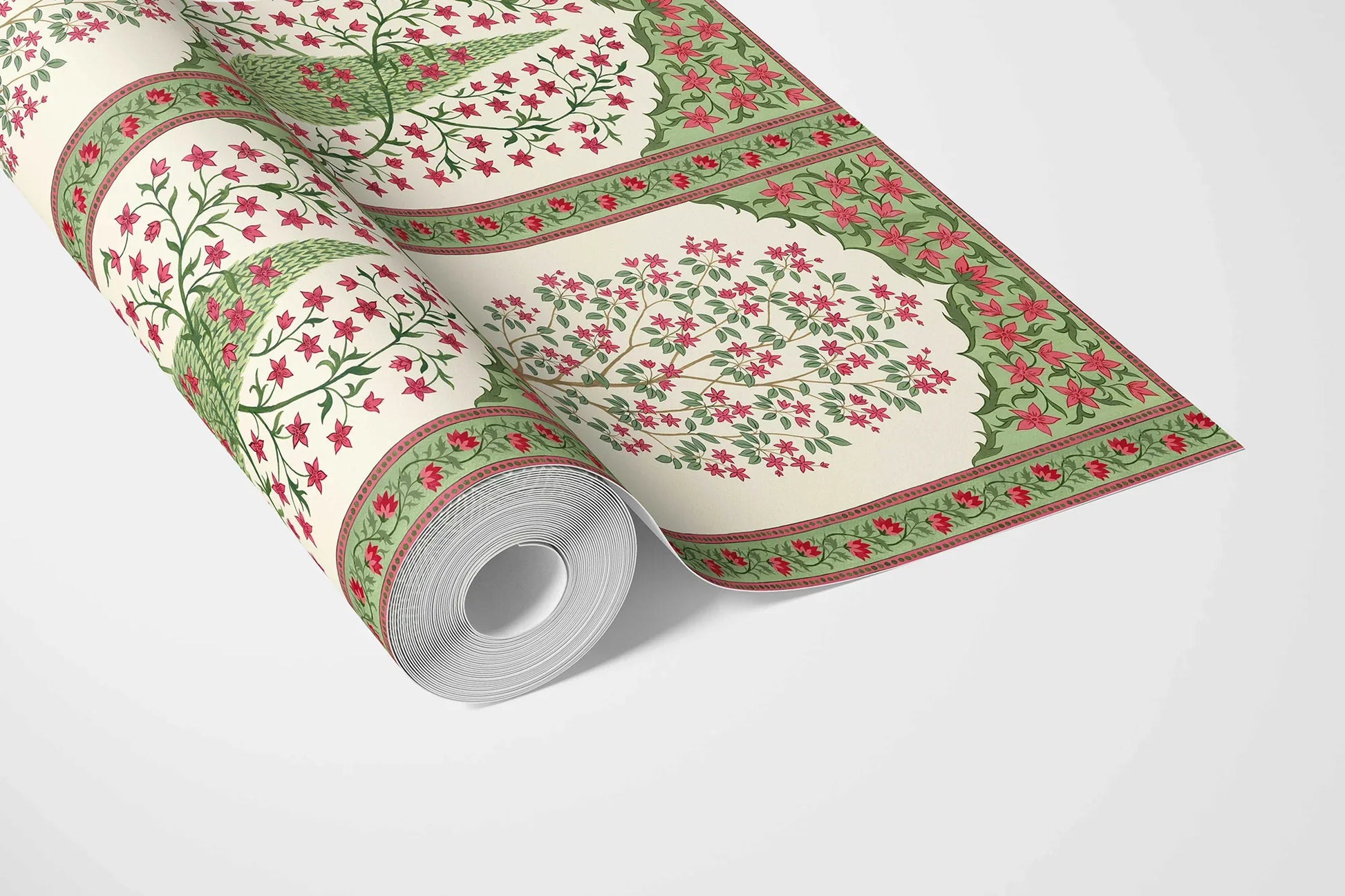 The repeating panels feature rich blossoms and stylised botanicals in a harmonious palette of crimson, green, and ivory, creating a wallscape that feels both opulent and serene. Whether used to transform an accent wall or to envelop an entire room, Gulzaar Mahal lends a sense of heritage charm while blending seamlessly into modern interiors.