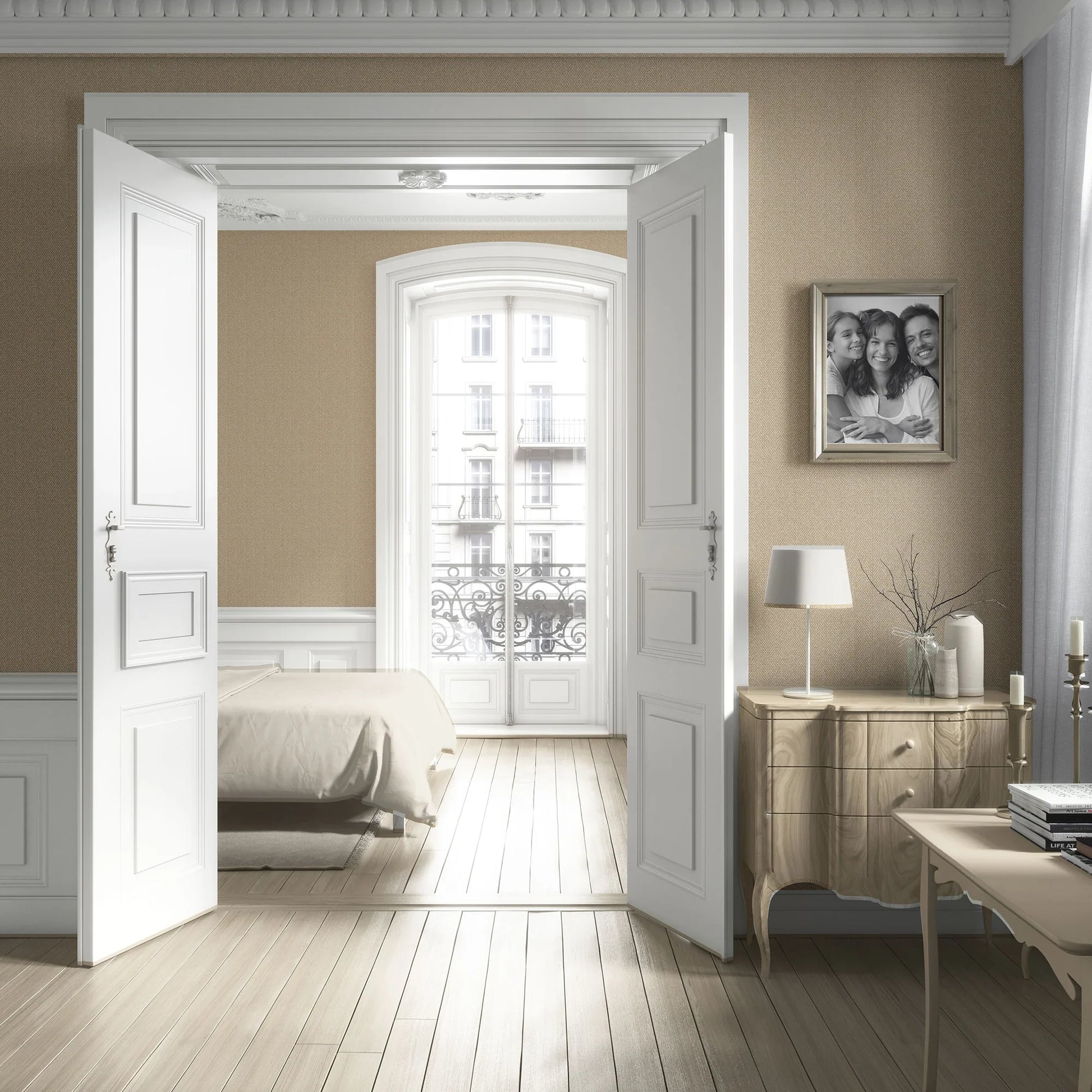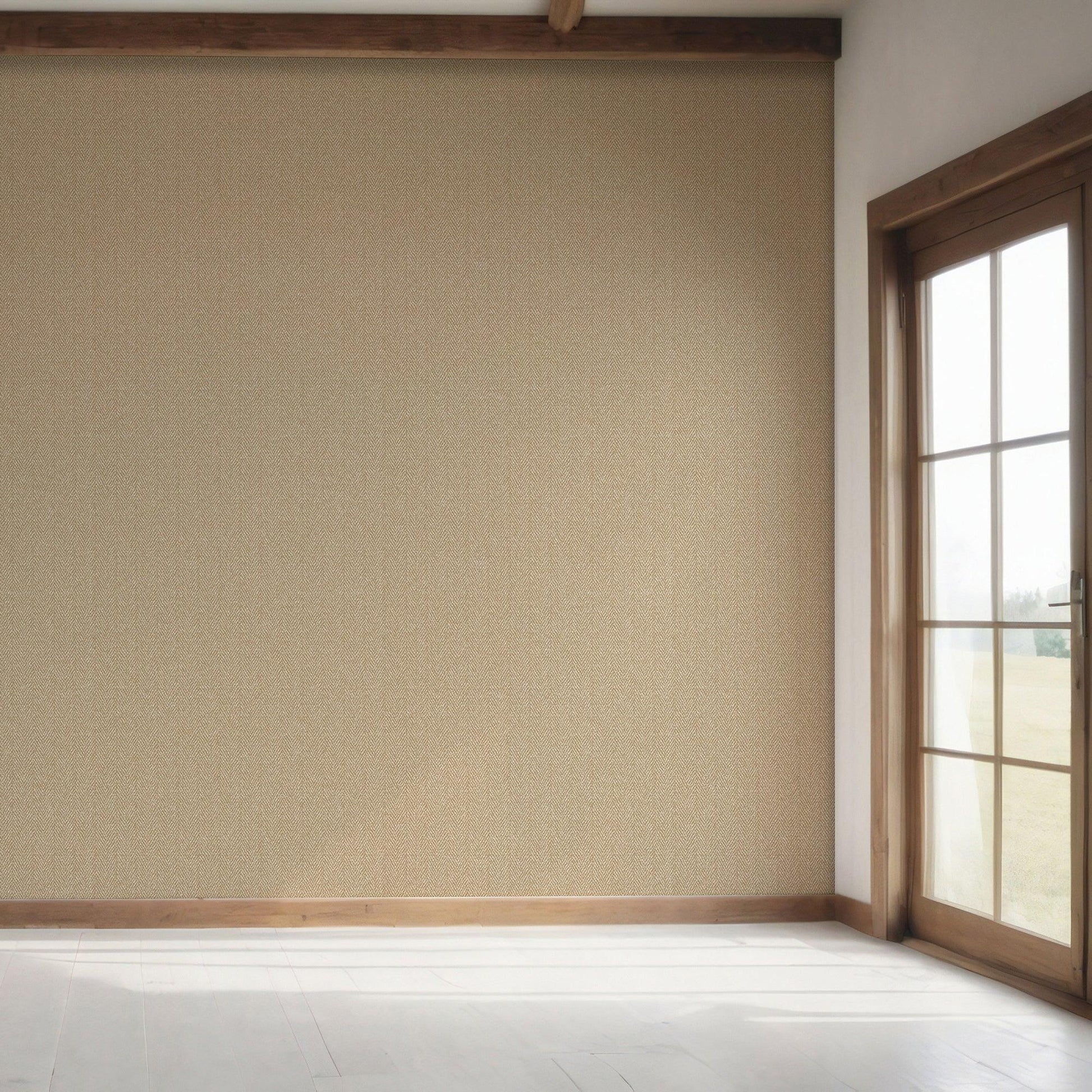 The subtle herringbone rhythm creates a soft, fabric-like surface that reads almost solid from a distance, yet reveals its craftsmanship up close. Designed for versatility, Herringford Linen Wallpaper works beautifully across living rooms, bedrooms, studies, corridors, and refined commercial interiors—adding character while remaining timeless.