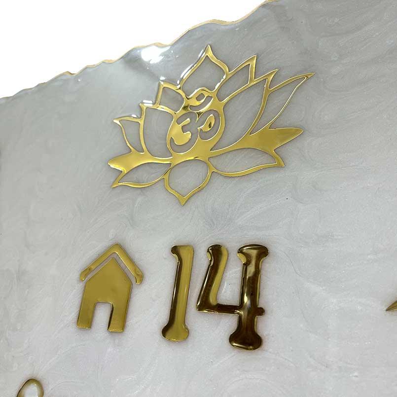 The Krishnaganesh - Pearl White Swirl Design Resin Nameplate presents a harmonious blend of spiritual significance and elegant design, welcoming guests with a sense of peace and prosperity. Handcrafted by skilled artisans with premium epoxy resin and finished with a high-gloss sheen, this rectangular zigzag-shaped nameplate features a delicate pearl white base with a captivating swirl design.