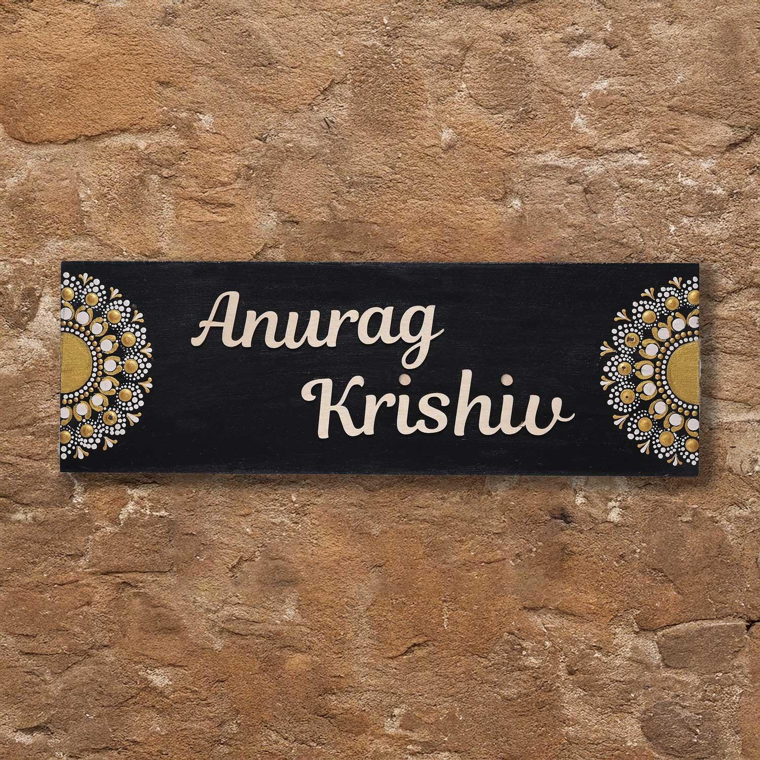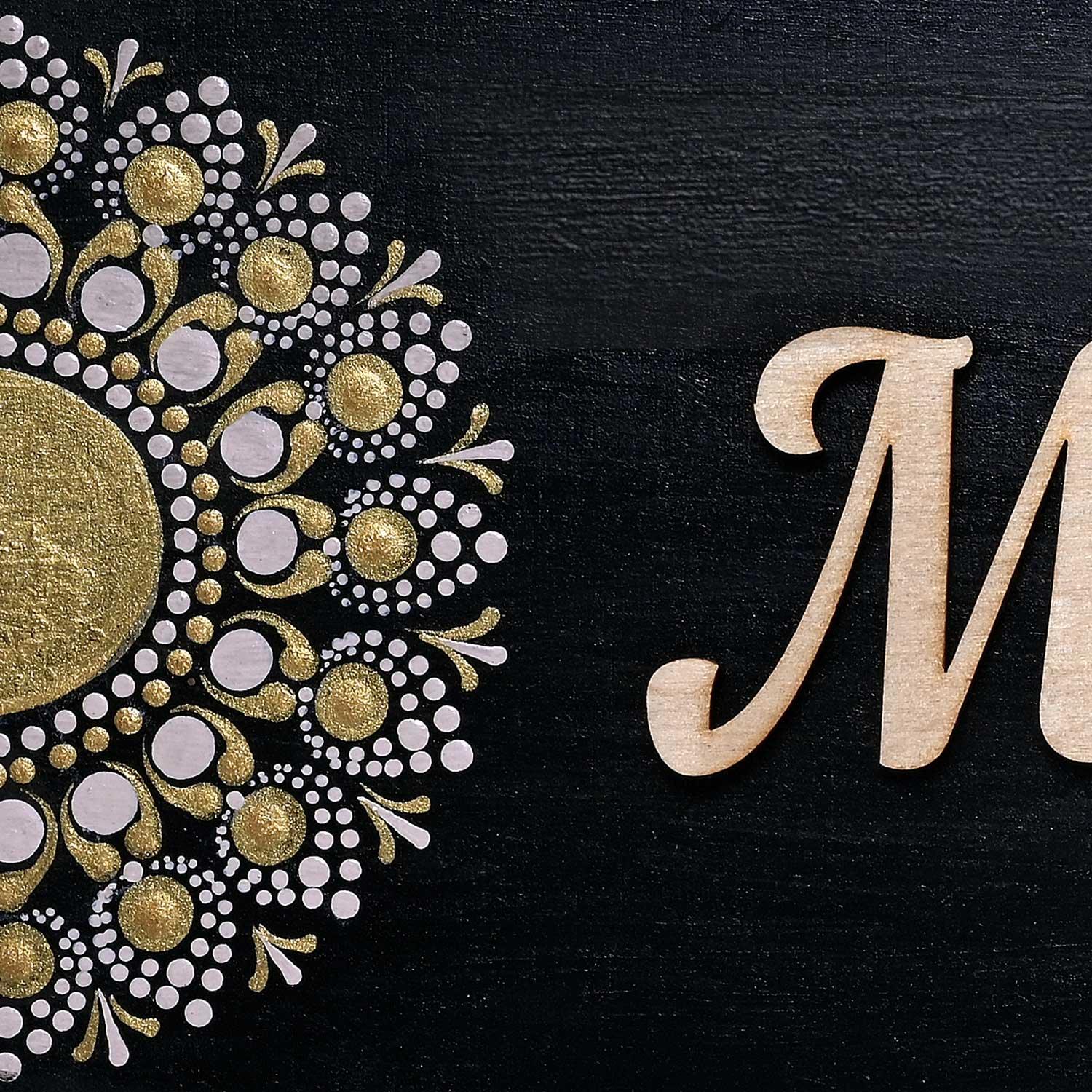 Elegant and timeless, the Midnight Gold Mandala Nameplate is a celebration of handcrafted beauty. Measuring 12 inch × 4 inch, this piece features a deep, dark brown MDF base reminiscent of a midnight sky, adorned with intricate mandala dotwork in shimmering gold and soft white. Each mandala is hand-painted with meticulous care by skilled artists.