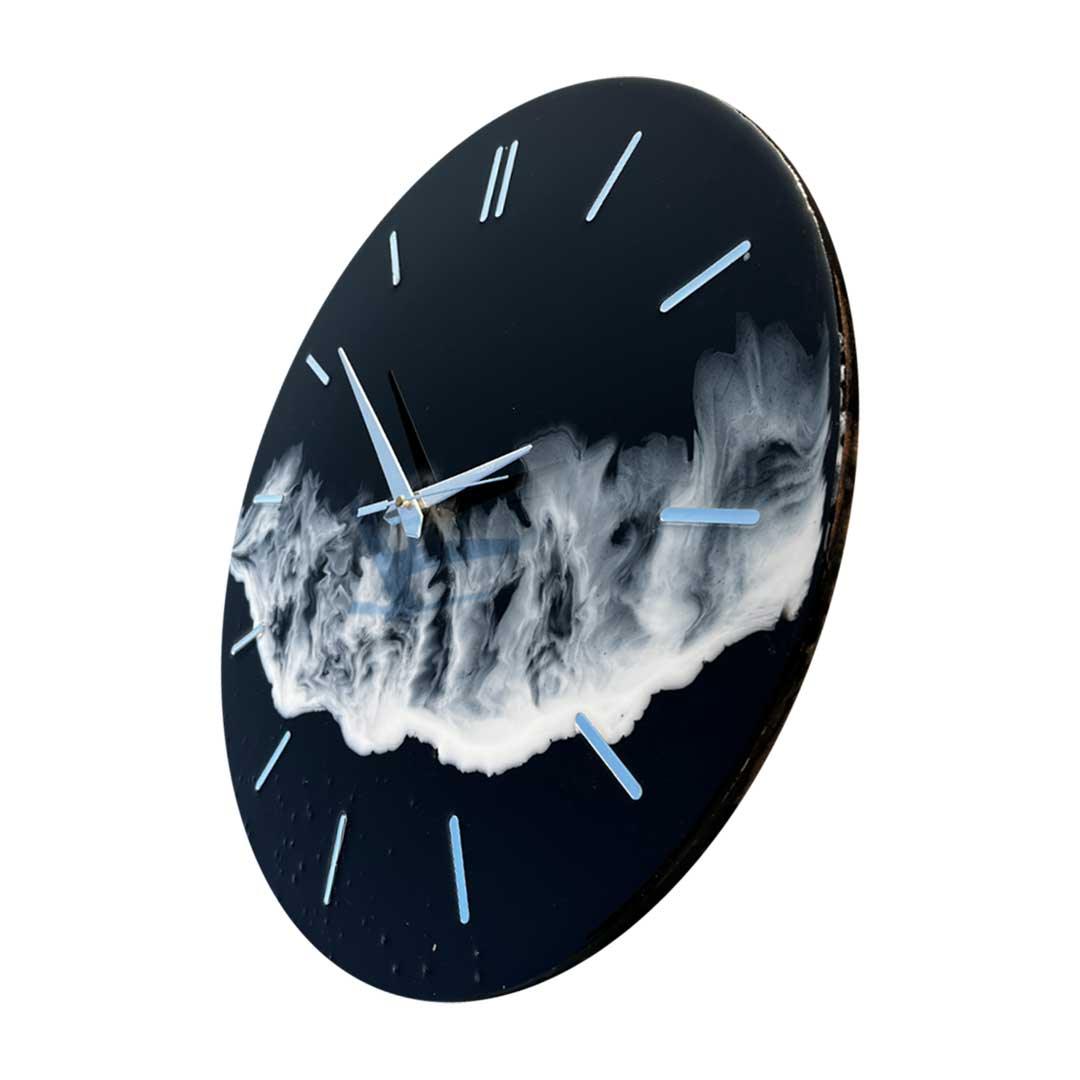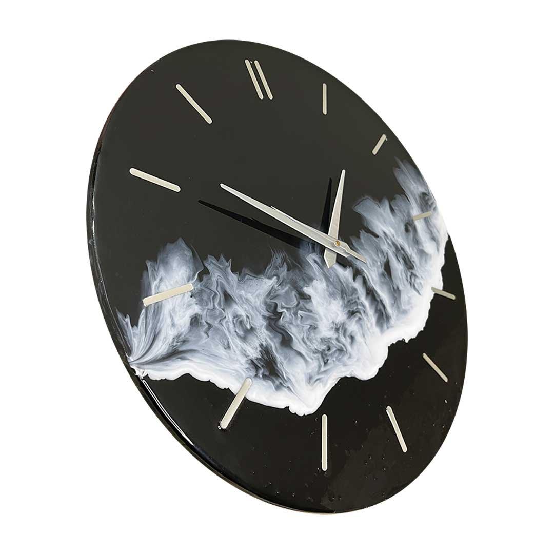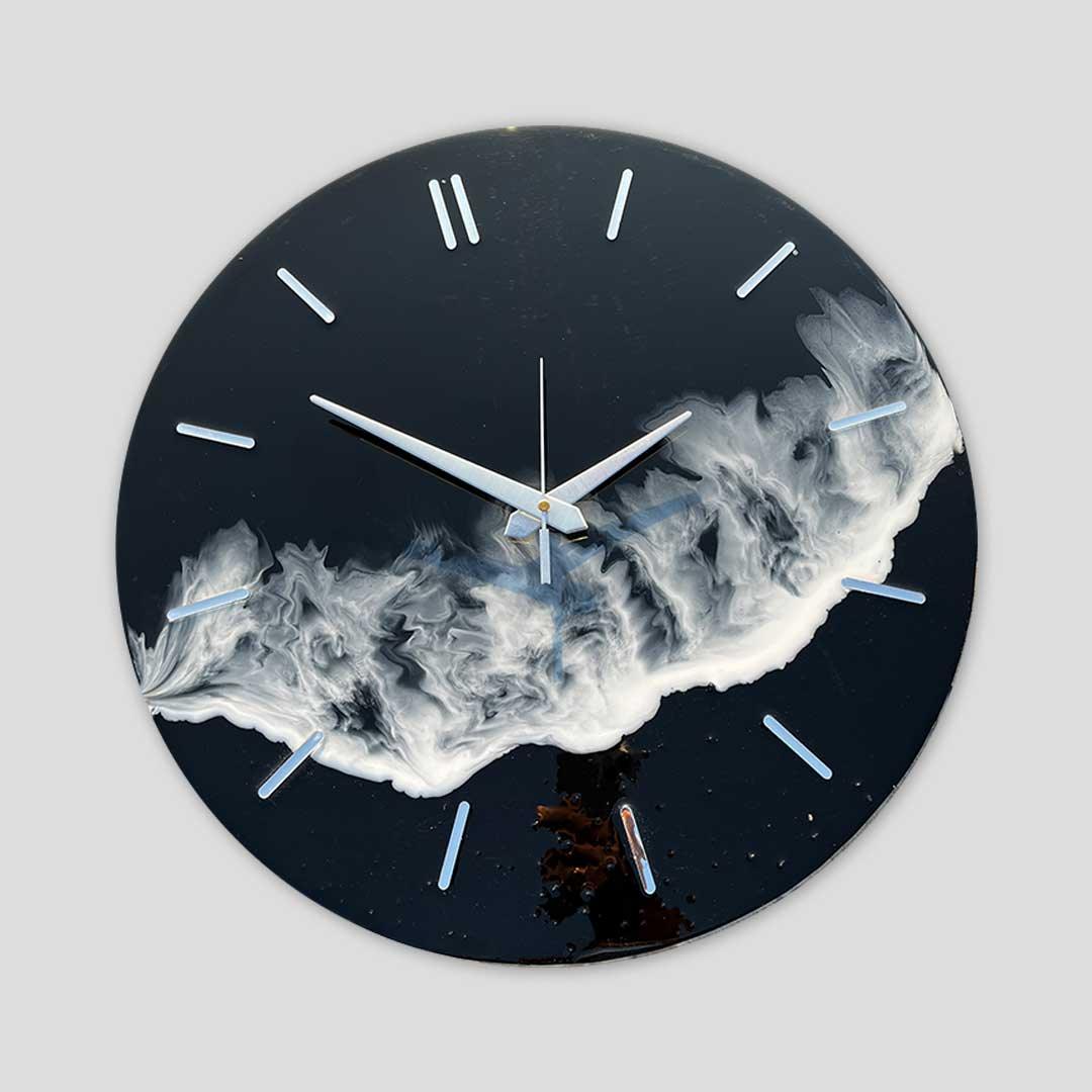Add a wave of elegance to your space with the Midnight Ocean Resin Wall Clock. This handcrafted analog clock showcases a bold black resin base infused with flowing white ocean-like patterns. Finished with a high-gloss shine and detailed with silver acrylic markers, this 16-inch circular timepiece brings modern luxury to any room in your home, flat, or bungalow.