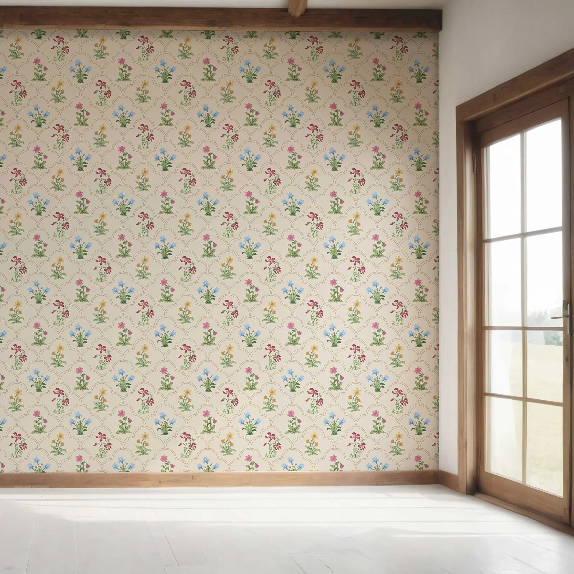 Bring timeless elegance into your space with the Nishat Wallpaper, a design inspired by the lush Mughal gardens that once flourished in palatial courtyards. Each floral motif blooms within graceful scalloped arches, creating a sense of harmony and rhythm across your walls.