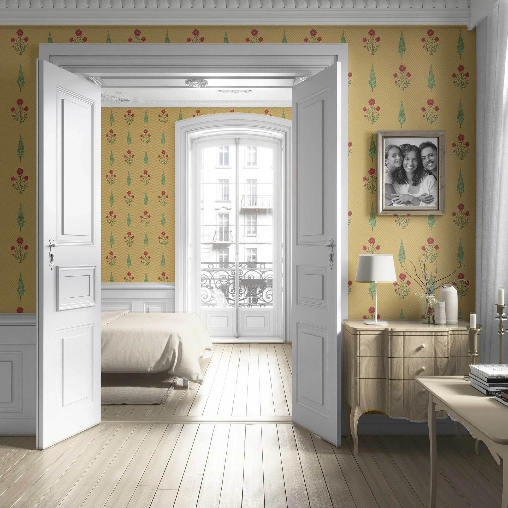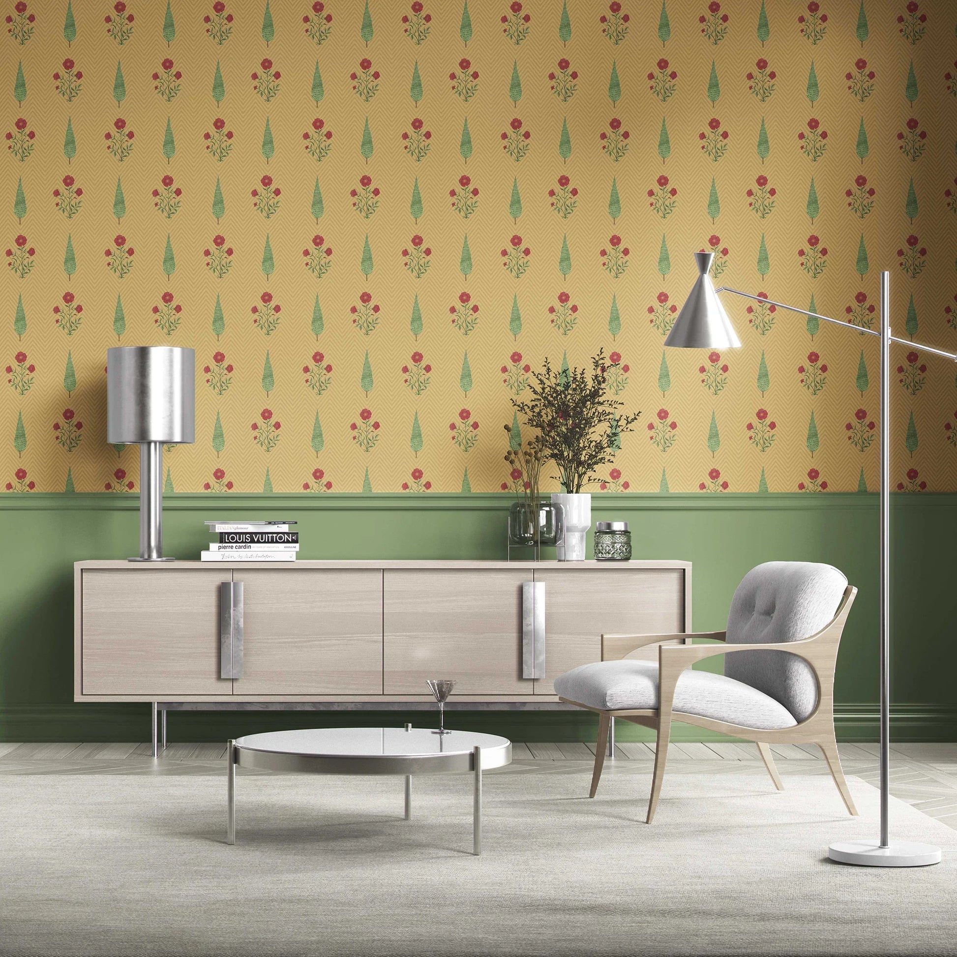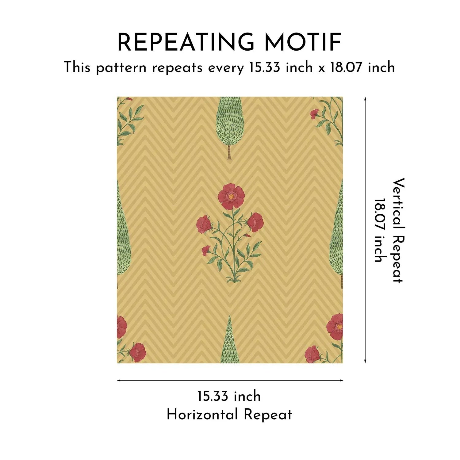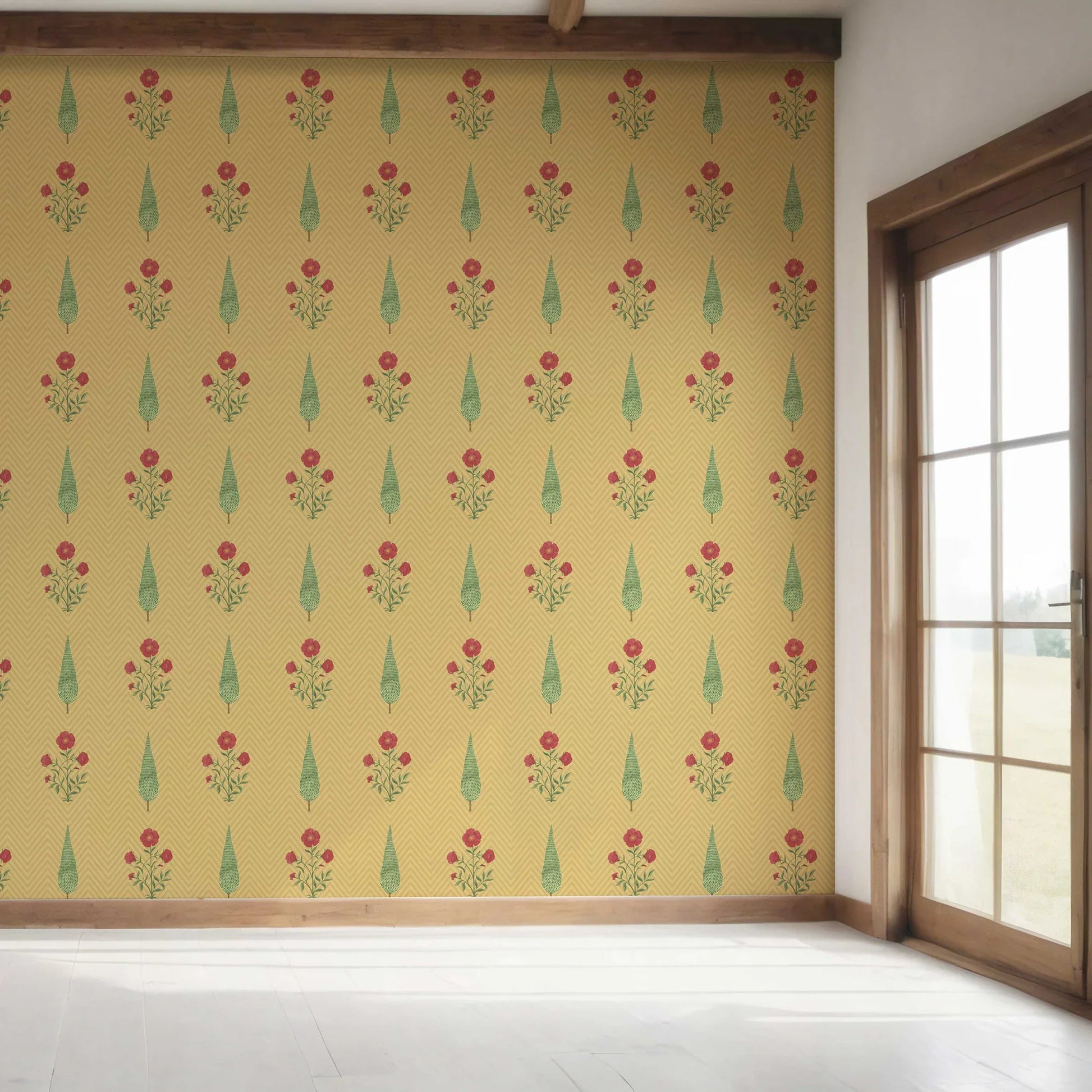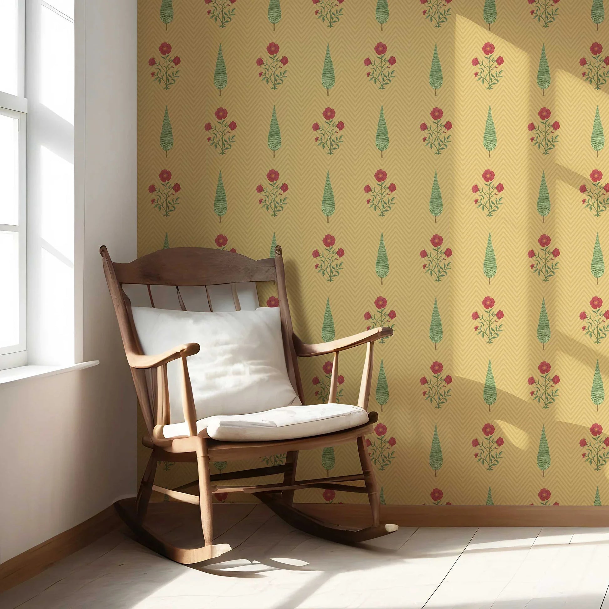Inspired by the grandeur of Mughal gardens and palatial chambers, the Shahgul Wallpaper blends symmetry, elegance, and floral artistry into a timeless design. The tall, cypress-like forms stand with quiet regality, while delicate blossoms weave softness into the pattern — creating a perfect balance of structure and grace.
