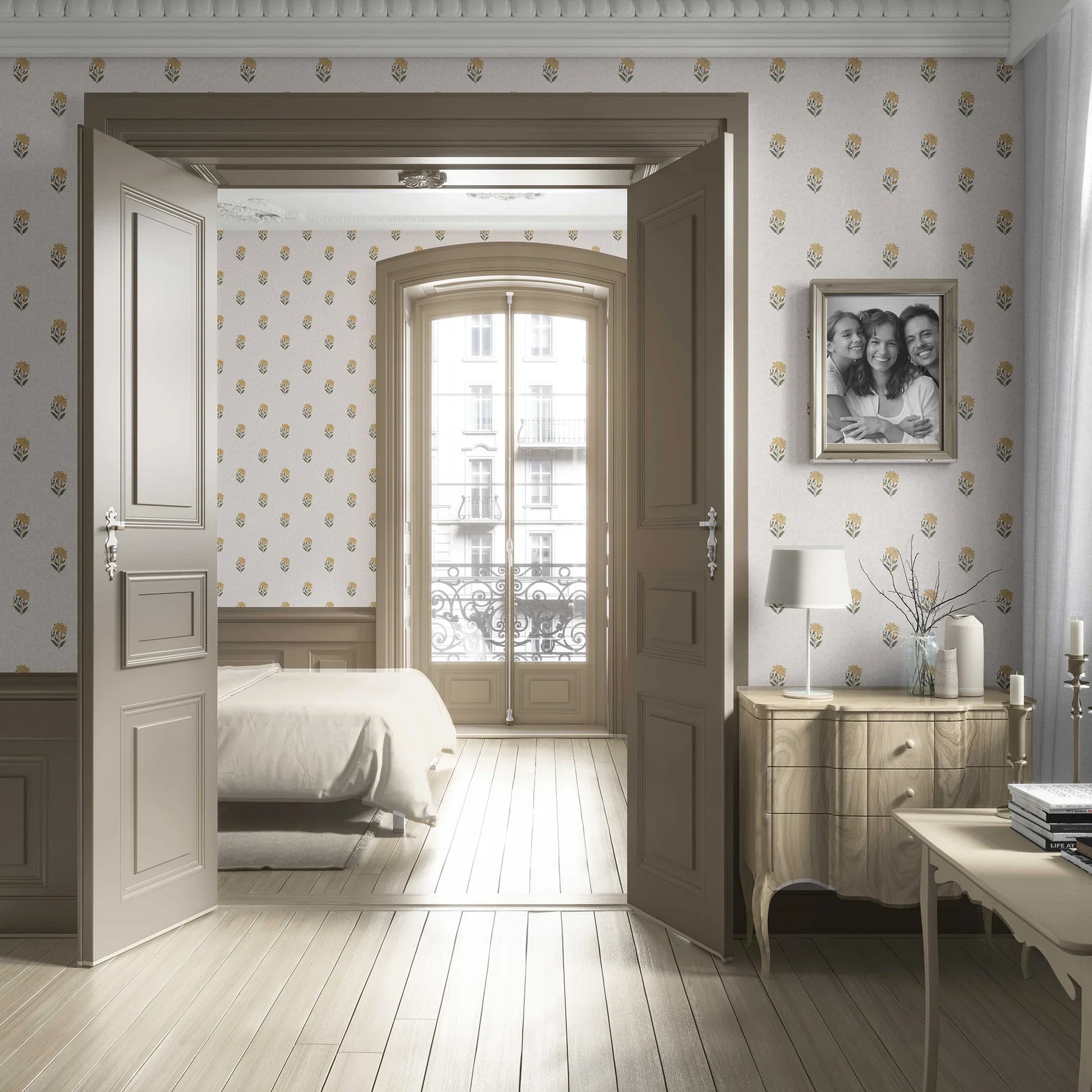 Ideal for bedrooms, reading nooks, or living spaces, Shahmina adds a soft, regal charm without overwhelming your interiors. Its detailed motif and airy layout make it versatile for both accent walls and full-room applications.