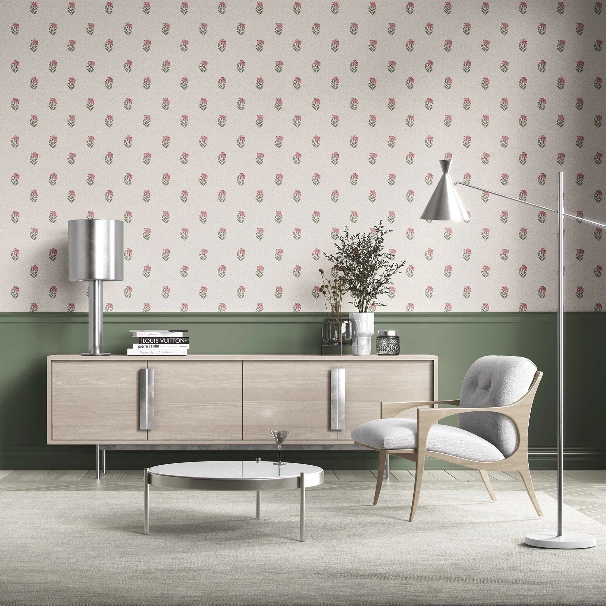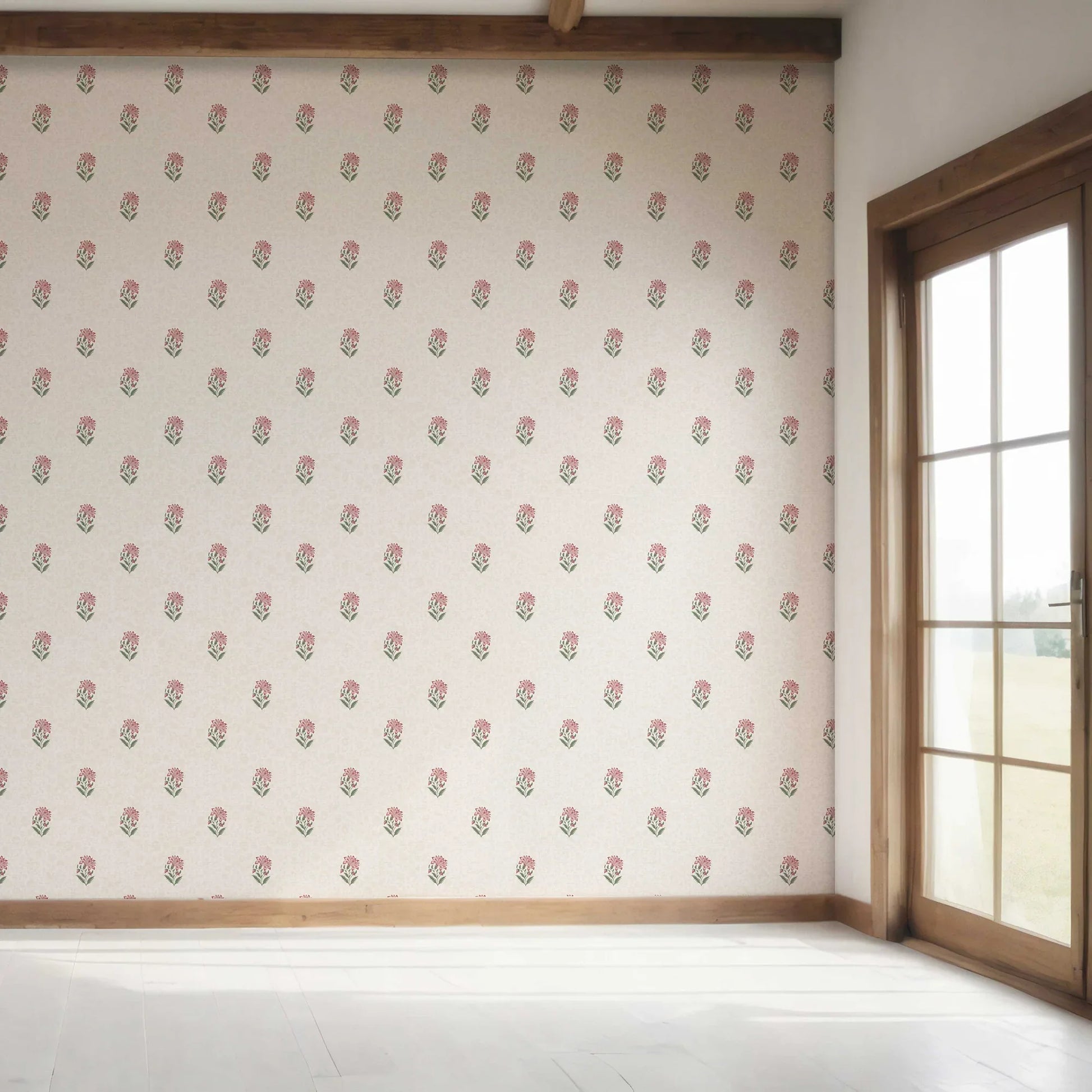 The Shahmina Wallpaper draws inspiration from Mughal miniature paintings and the timeless floral artistry of palace gardens. Featuring a delicately hand-drawn bloom repeated with symmetry and grace, this wallpaper strikes the perfect balance between elegance and simplicity.