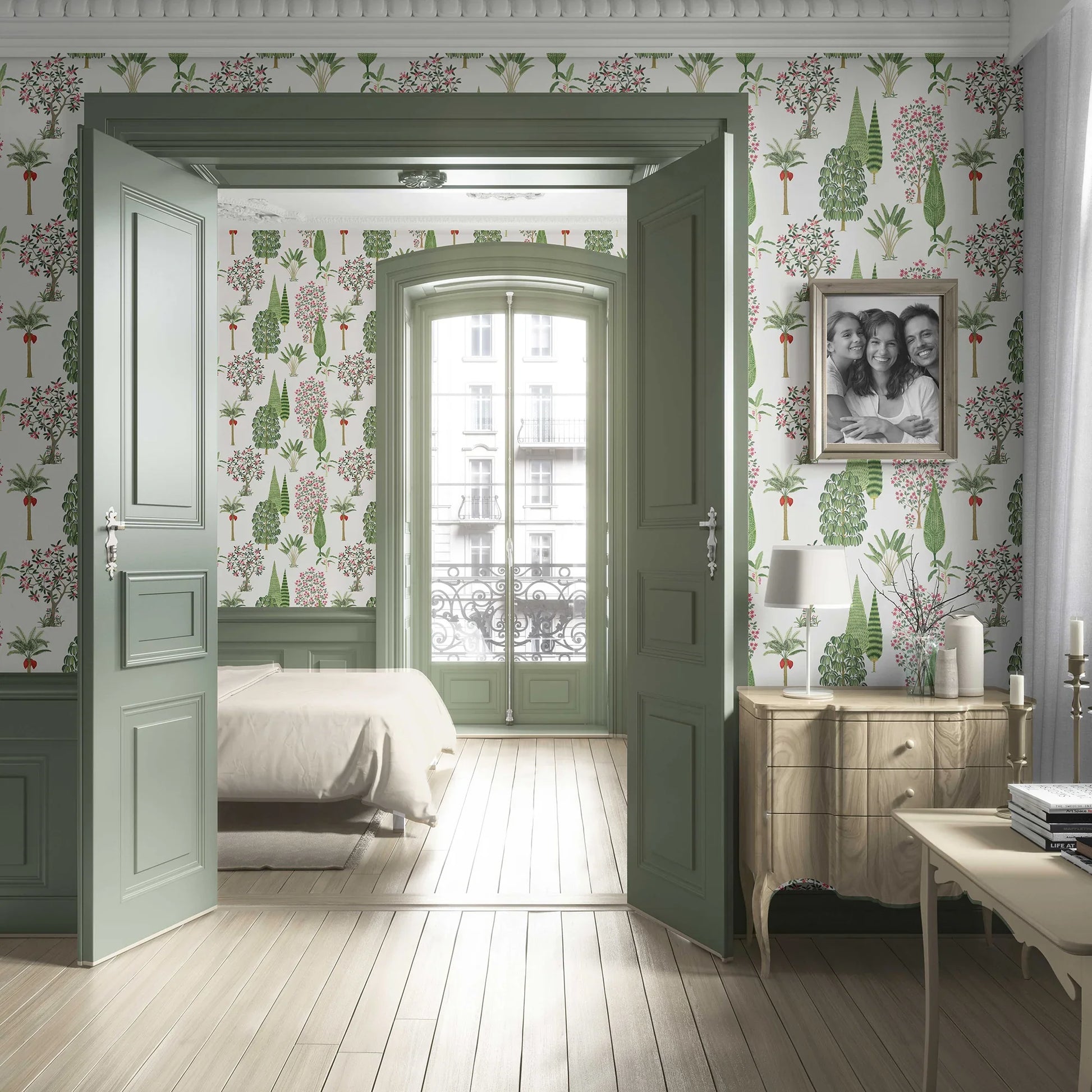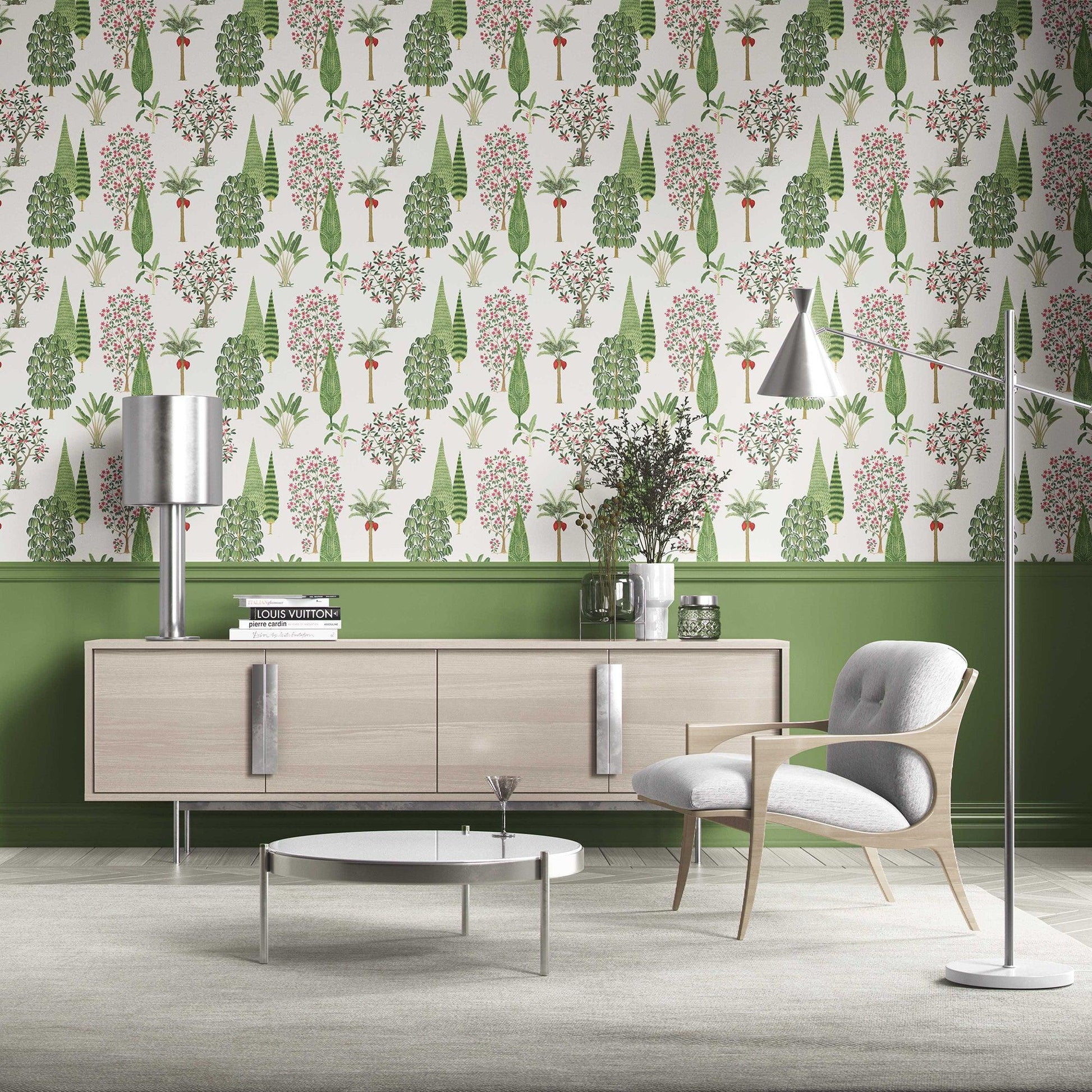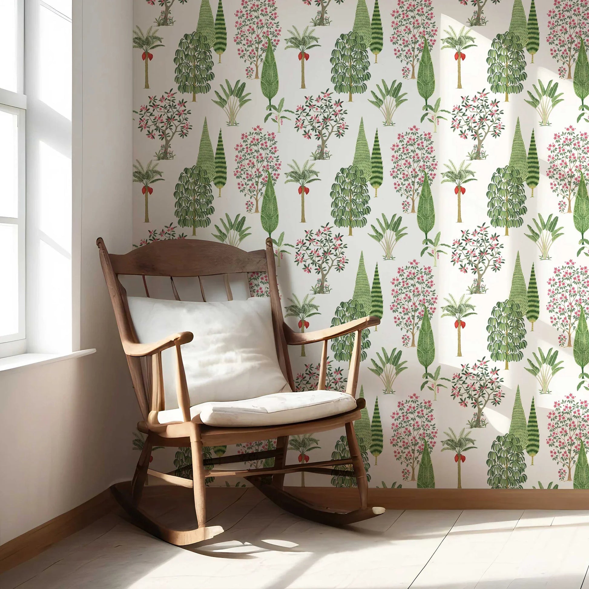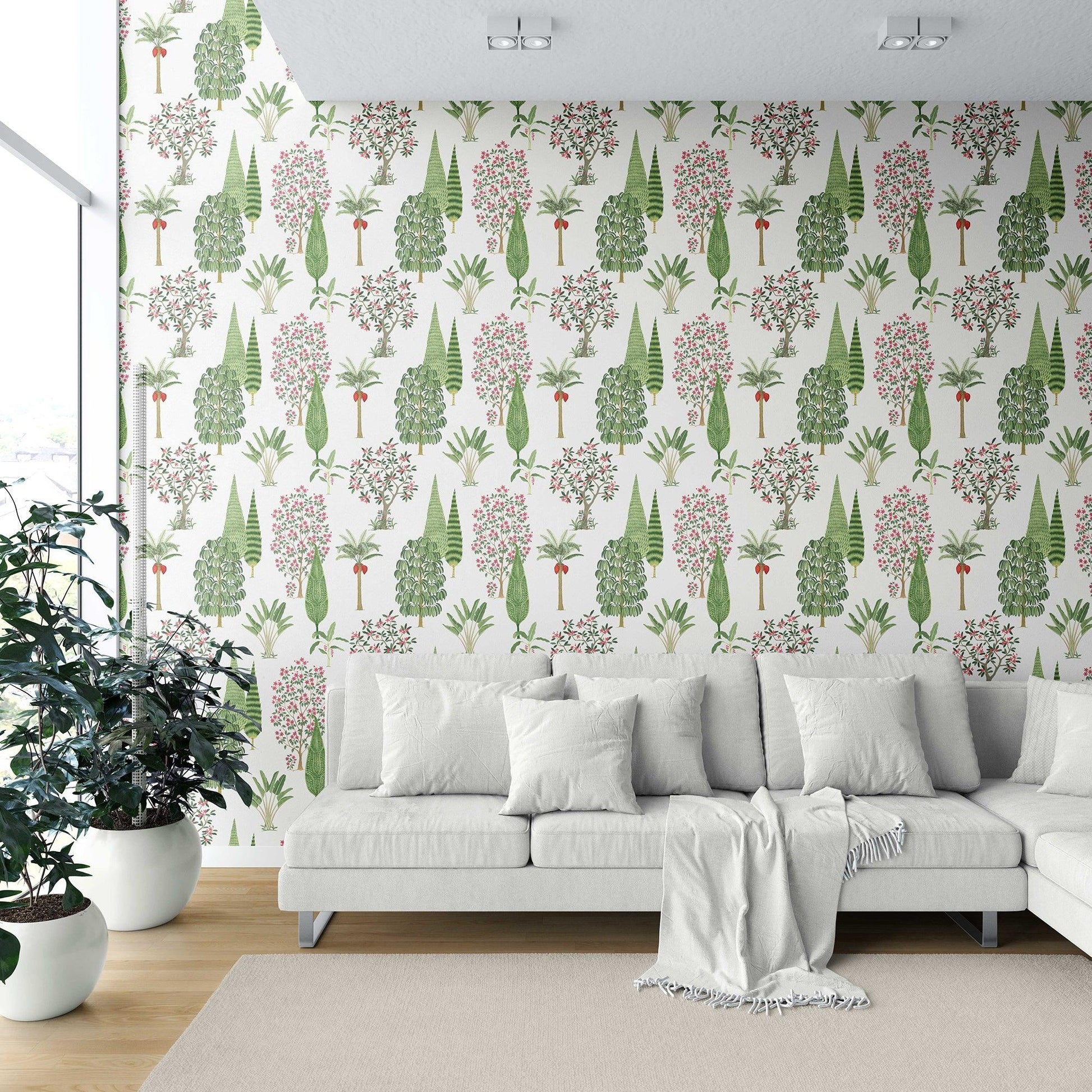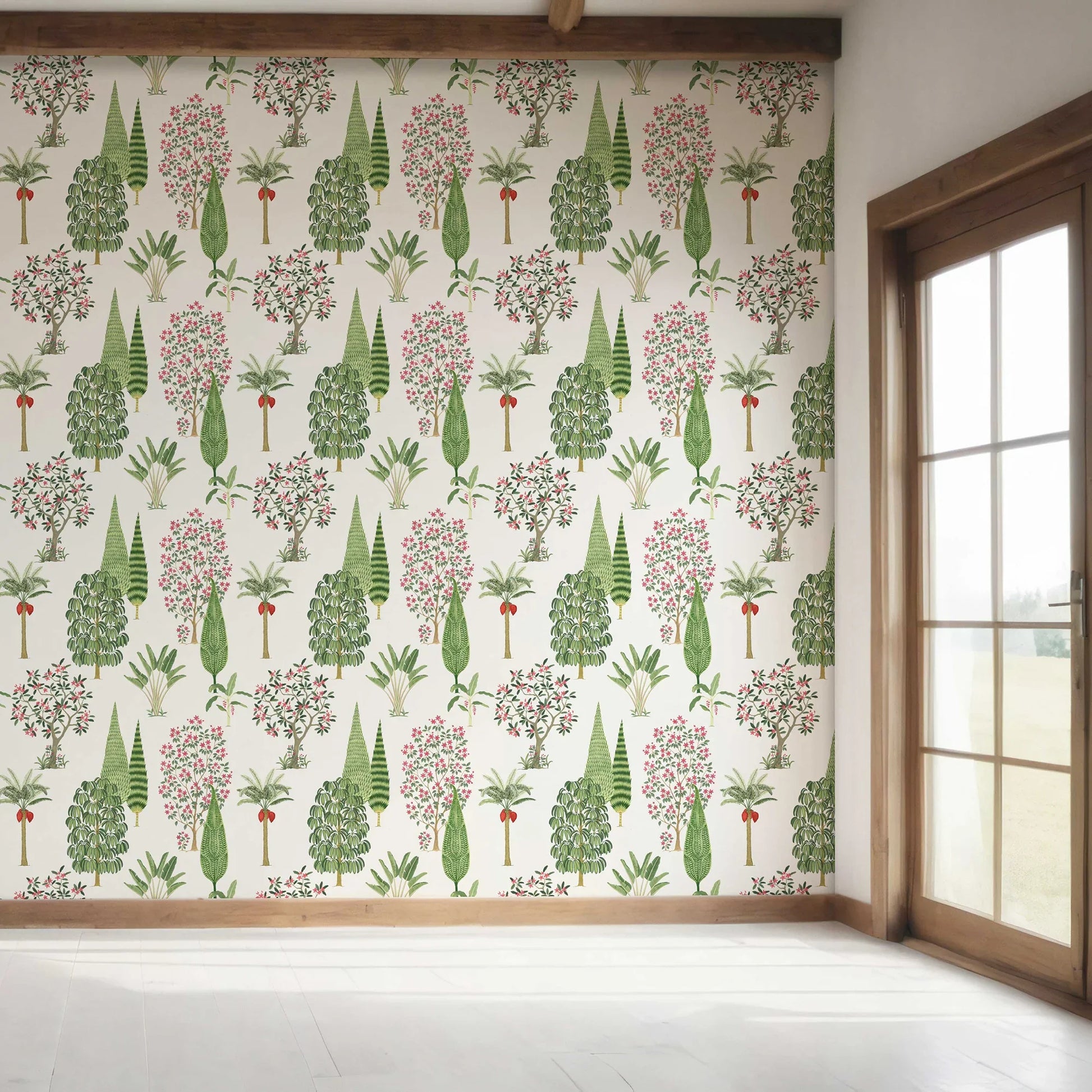 Evoking the splendour of Mughal garden artistry, the Shalimar Wallpaper is a celebration of abundance and harmony. Inspired by the legendary Shalimar Gardens of Kashmir, this design brings together a rich tapestry of cypress, palms, flowering trees, and shrubs, arranged with elegance and rhythm.