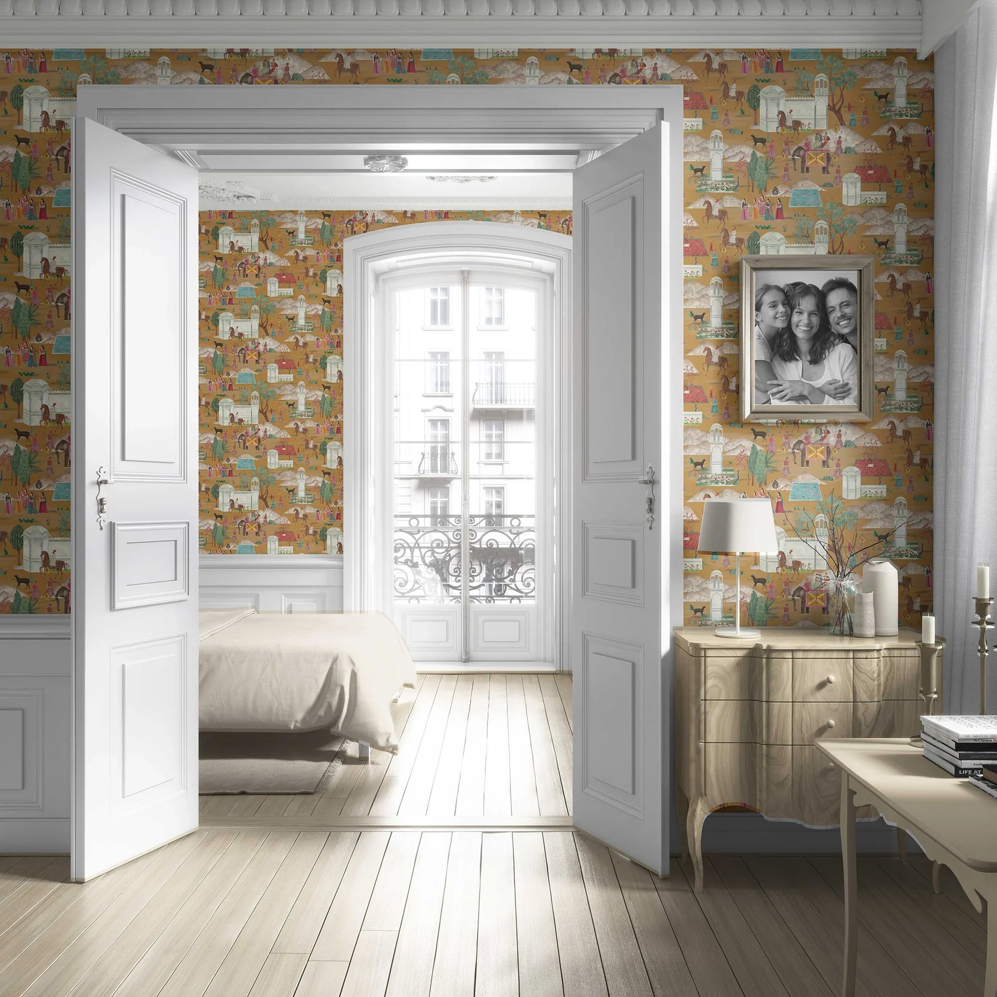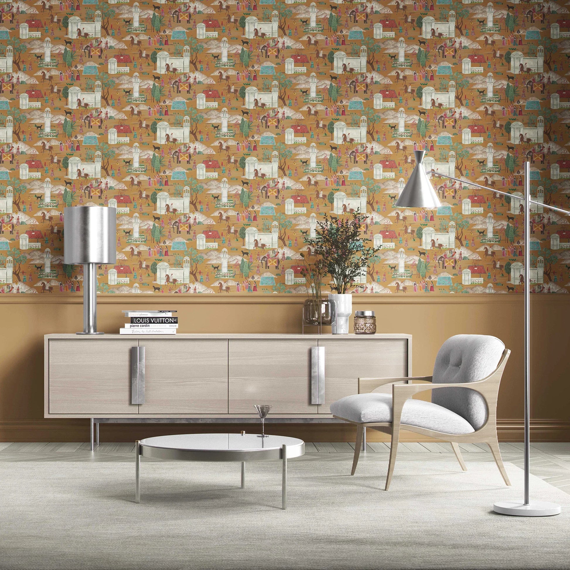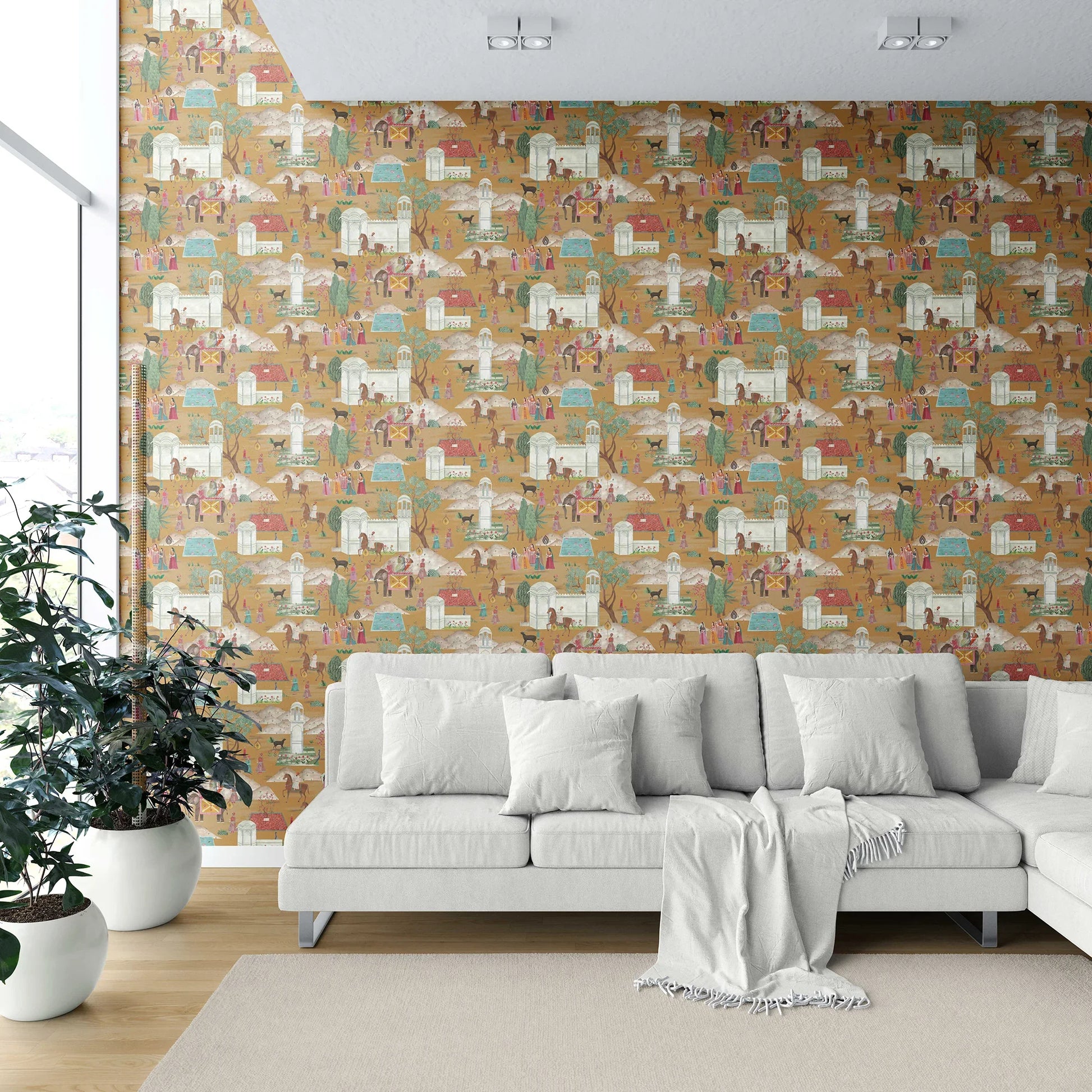 Bring home the vibrant stories of Rajasthan with the Shekhawati Tales Wallpaper, a striking design inspired by the frescoes and havelis of the Shekhawati region. This wallpaper captures the spirit of desert towns where history, folklore, and artistry meet.
