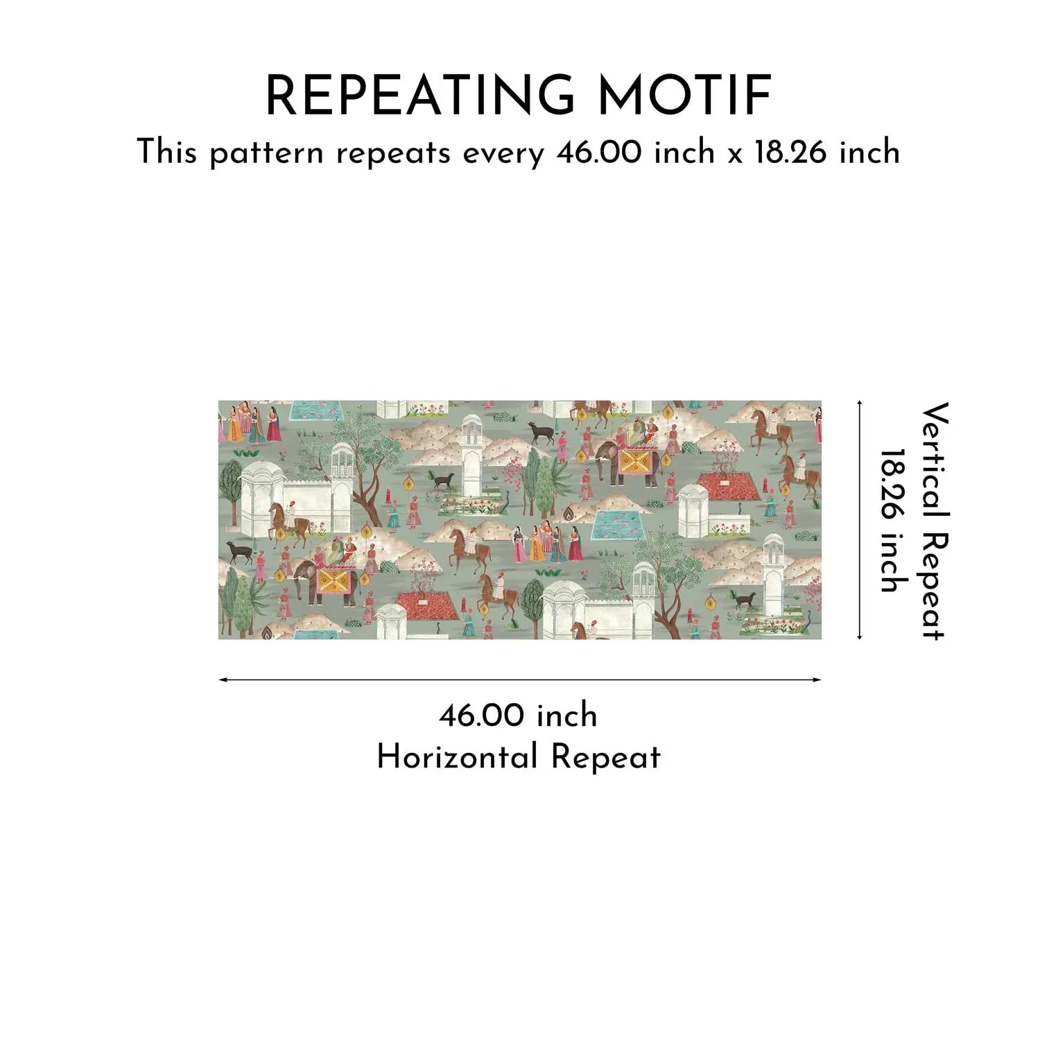 Hand-drawn scenes of royal processions, ornate pavilions, and lush courtyards evoke a timeless charm, making it a perfect choice for statement walls, cultural spaces, or homes that celebrate Indian heritage. Printed with precision, every detail pays homage to the region’s famed murals, turning your walls into a canvas of storytelling.