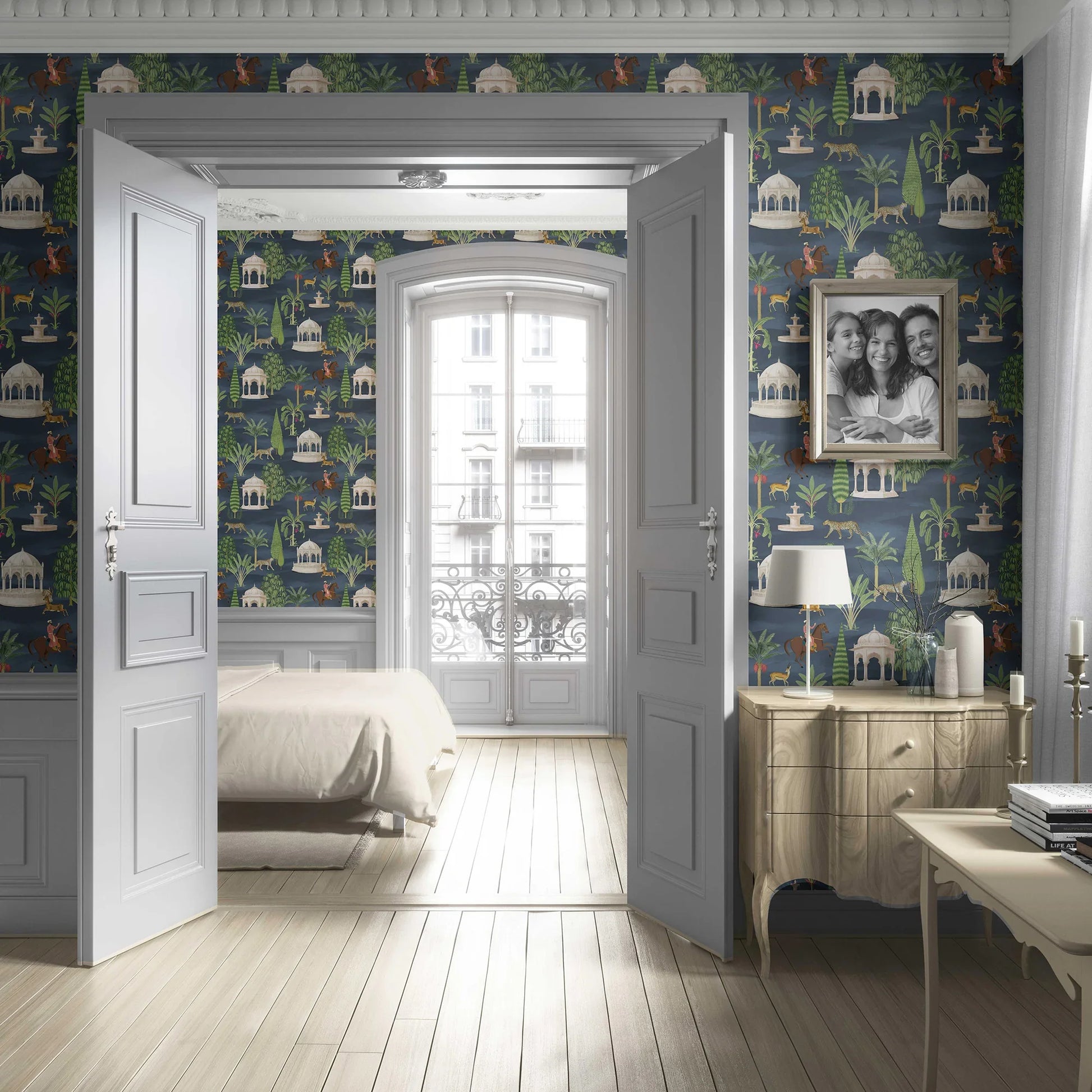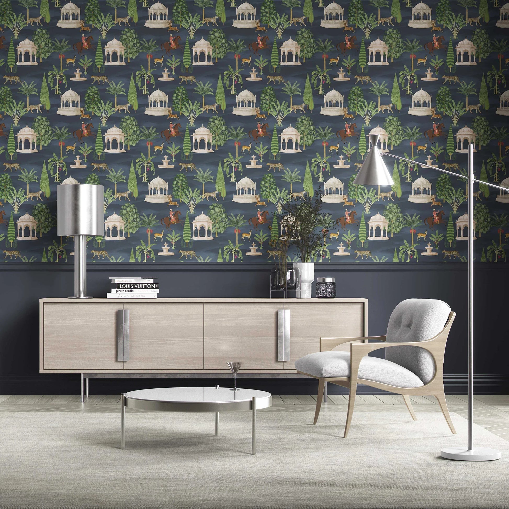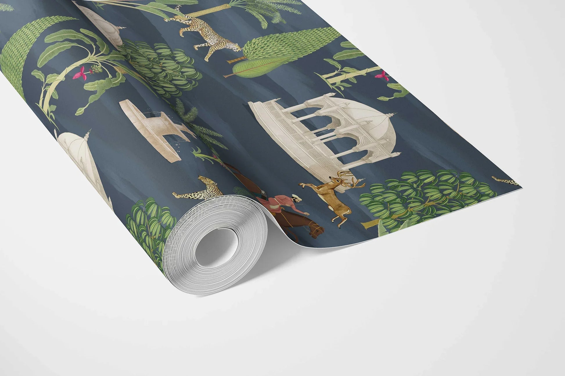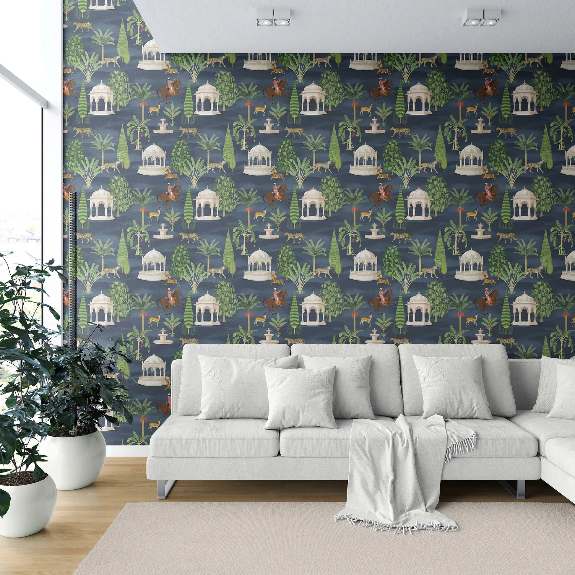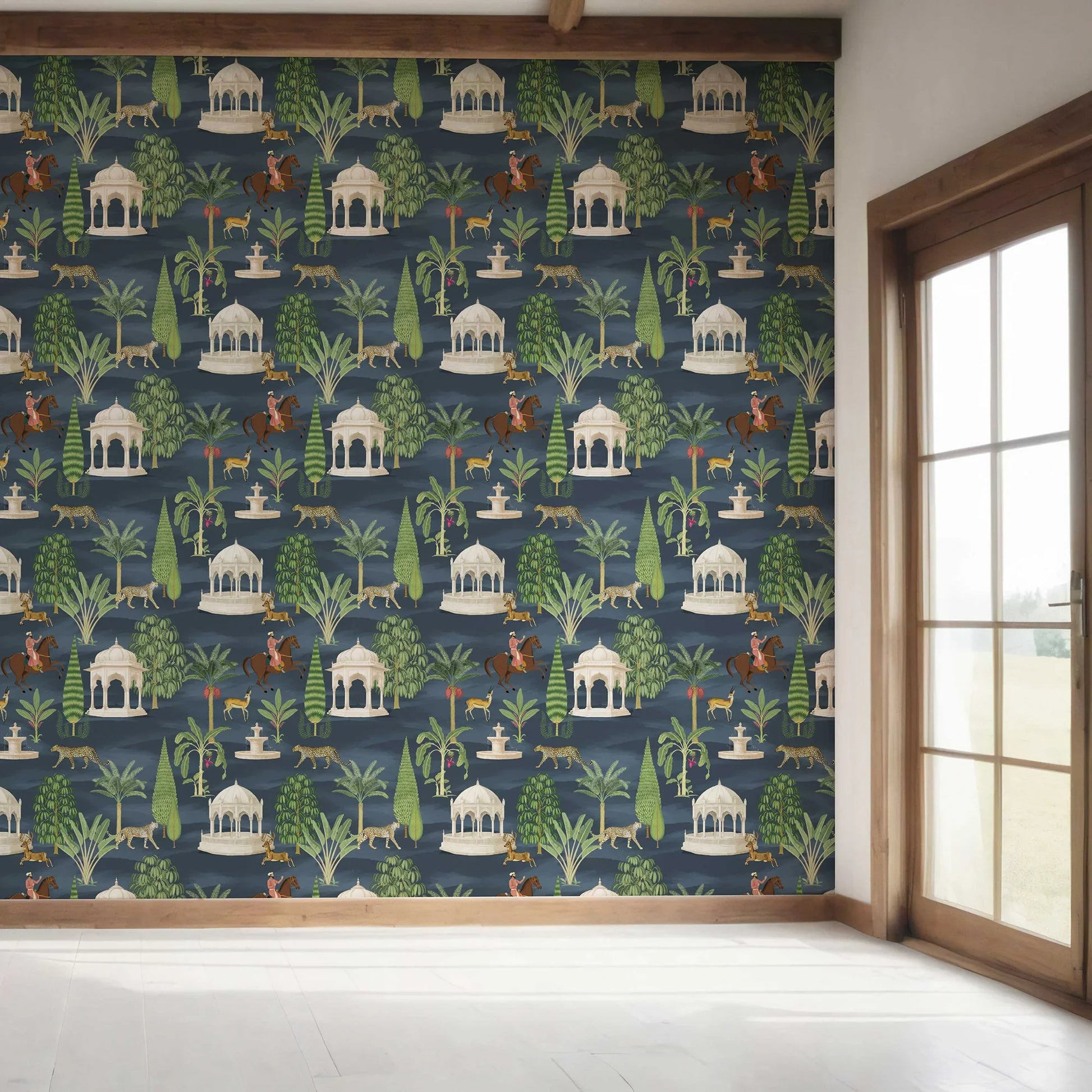 Step into the grandeur of India’s royal hunting grounds with the Shikargah Wallpaper — a breathtaking ode to the art, architecture, and wildlife of a bygone era. Inspired by Mughal shikargahs (game reserves), this intricate design brings to life serene pavilions, majestic riders, elegant cheetahs, and graceful deer set amidst lush tropical foliage.