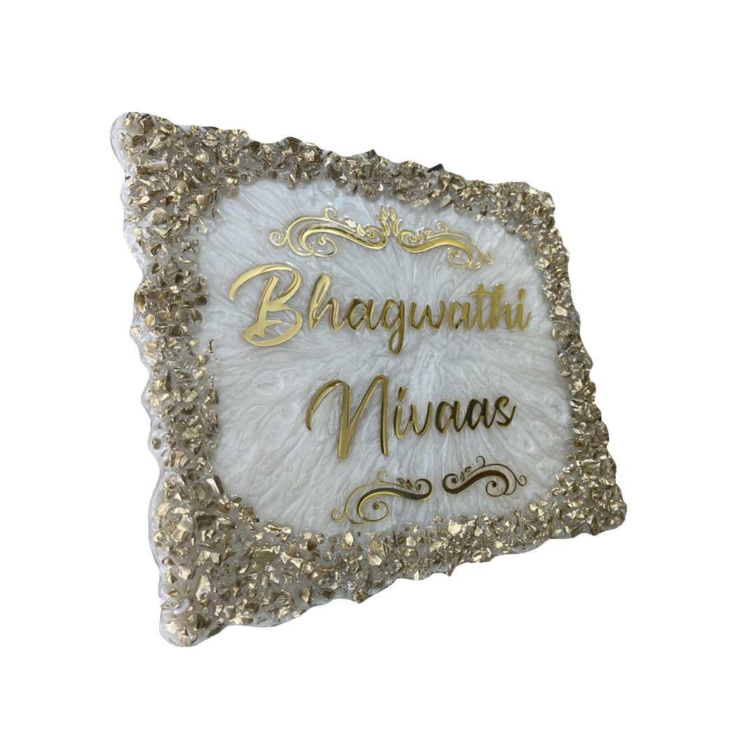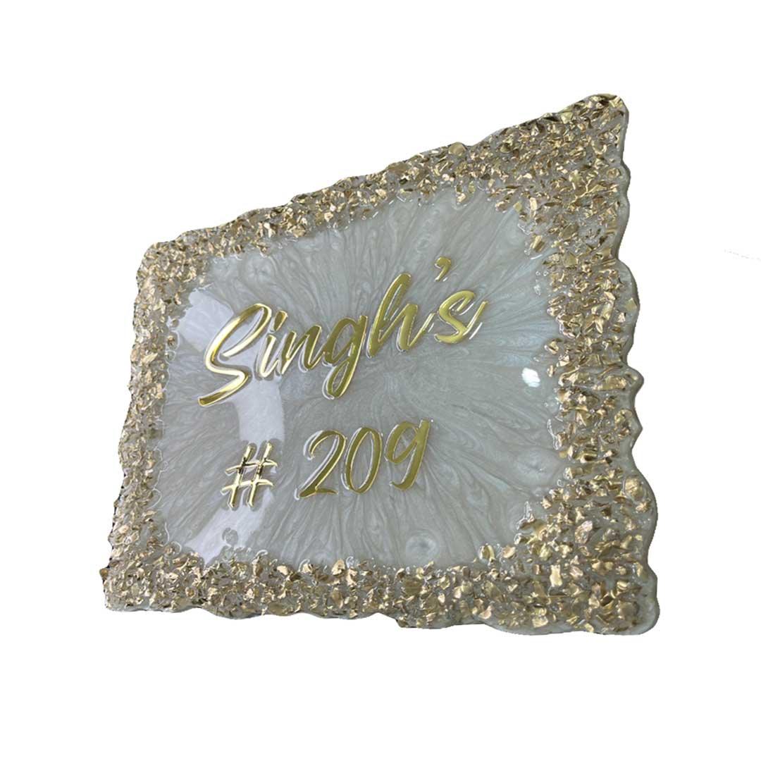The Singh's - Pearl Texture Resin Nameplate adds a touch of opulent elegance to your home's entrance. Handcrafted with premium epoxy resin, it features a pearl casting texture, embellished with sparkling golden crystals, all finished with a high-gloss sheen. Here are its salient features: