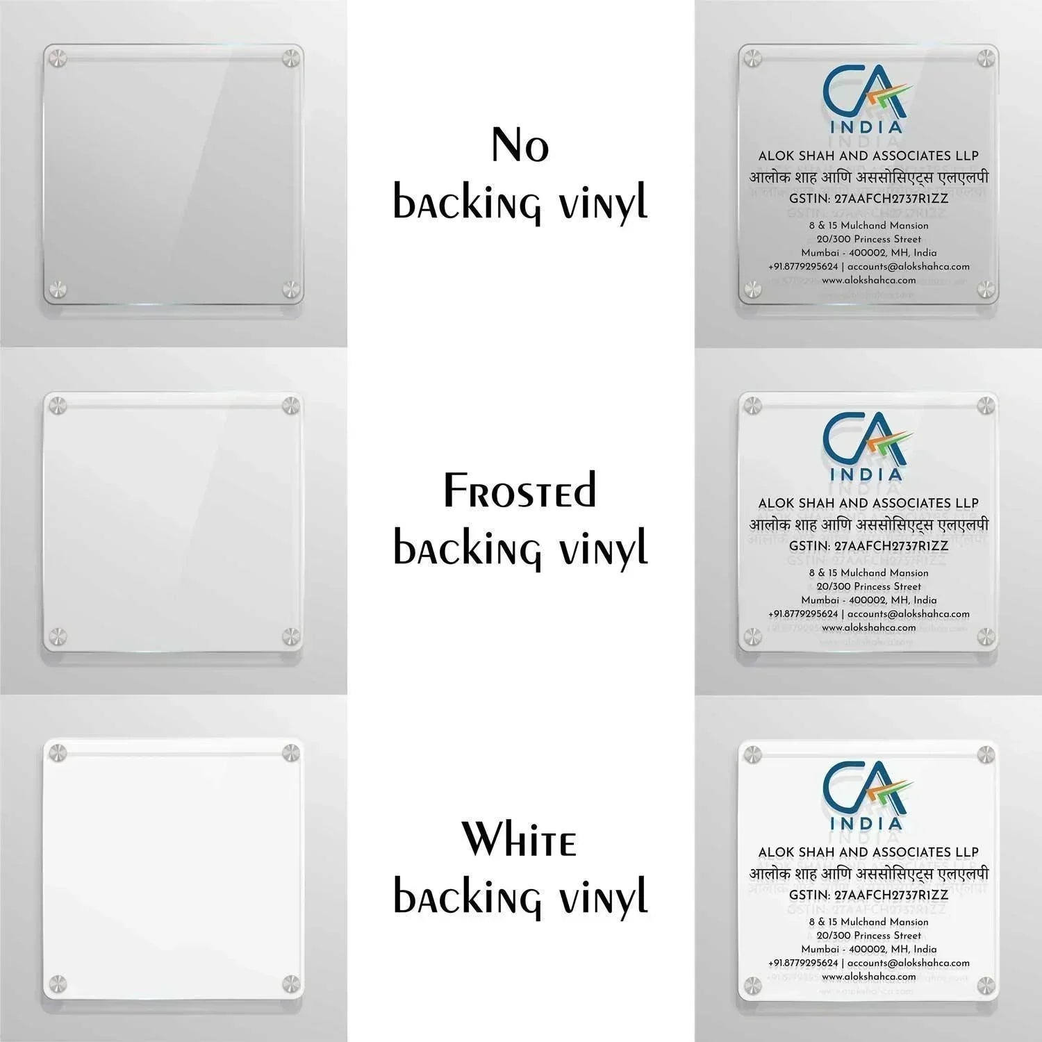 These signs have a crystal clean glass look with lettering in black. And while you can choose to keep it that way - you also have the option to add a backing vinyl, frosted or white, for better contrast.