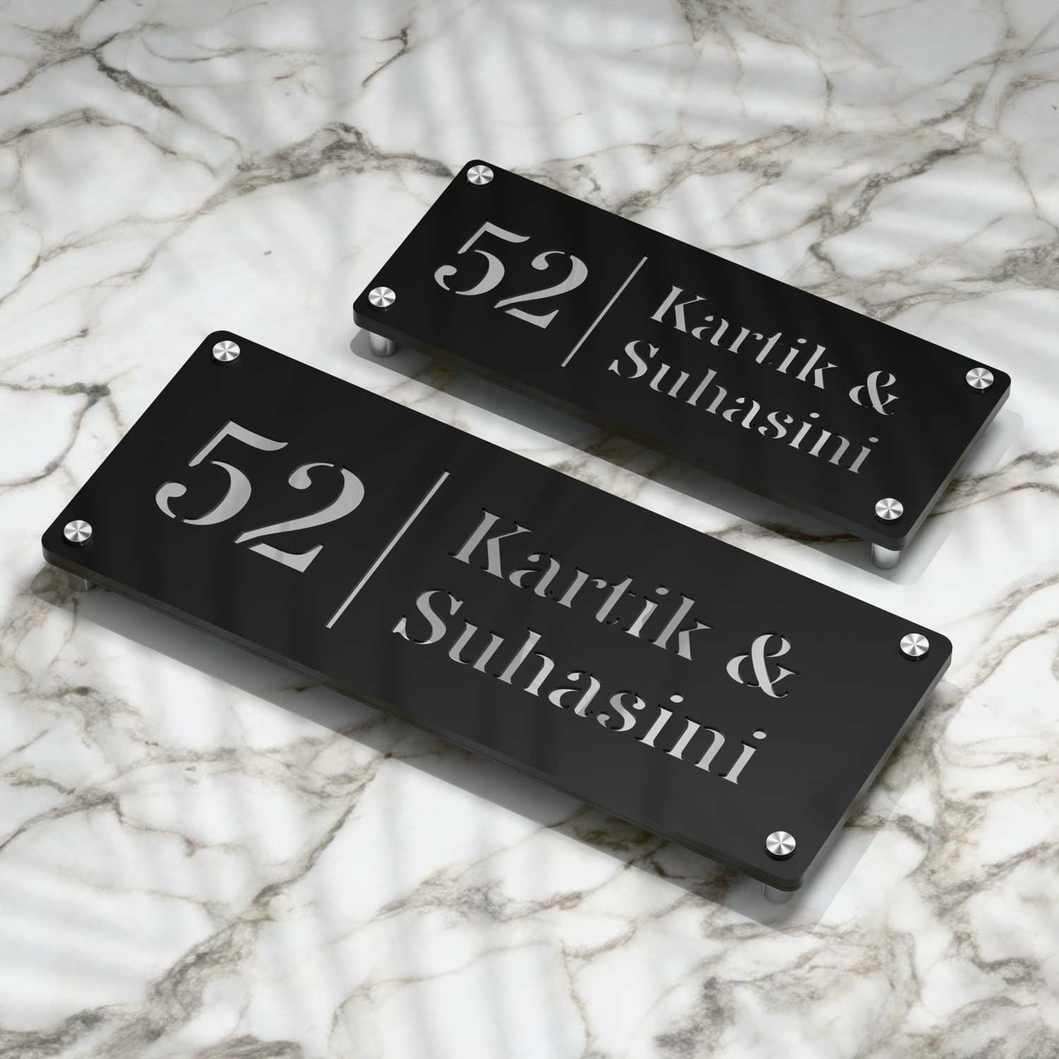 This nameplate features a 5mm matte black acrylic top layer laser-cut to reveal the mirror silver Aluminium Composite Panel (ACP) sheet below. The result is a refined play of light and depth — matte and mirror finishes working in harmony to create a striking first impression.