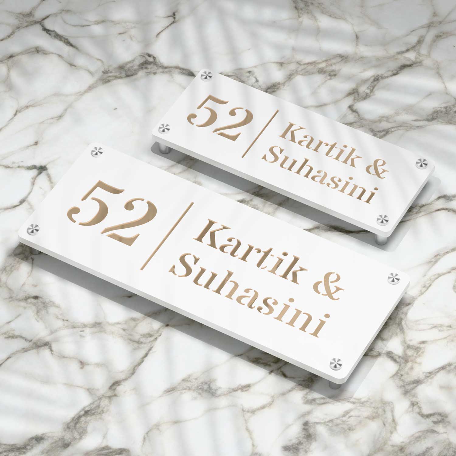 This nameplate features a 5mm matte white acrylic top layer laser-cut to reveal the mirror gold Aluminium Composite Panel (ACP) sheet below. The result is a refined play of light and depth — matte and mirror finishes working in harmony to create a striking first impression.