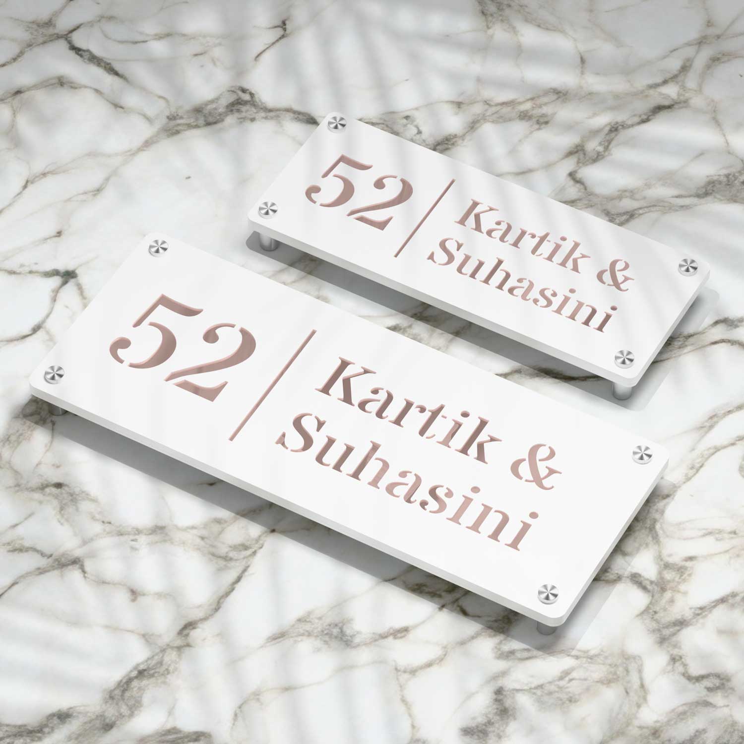 This nameplate features a 5mm matte white acrylic top layer laser-cut to reveal the mirror rose gold Aluminium Composite Panel (ACP) sheet below. The result is a refined play of light and depth — matte and mirror finishes working in harmony to create a striking first impression.