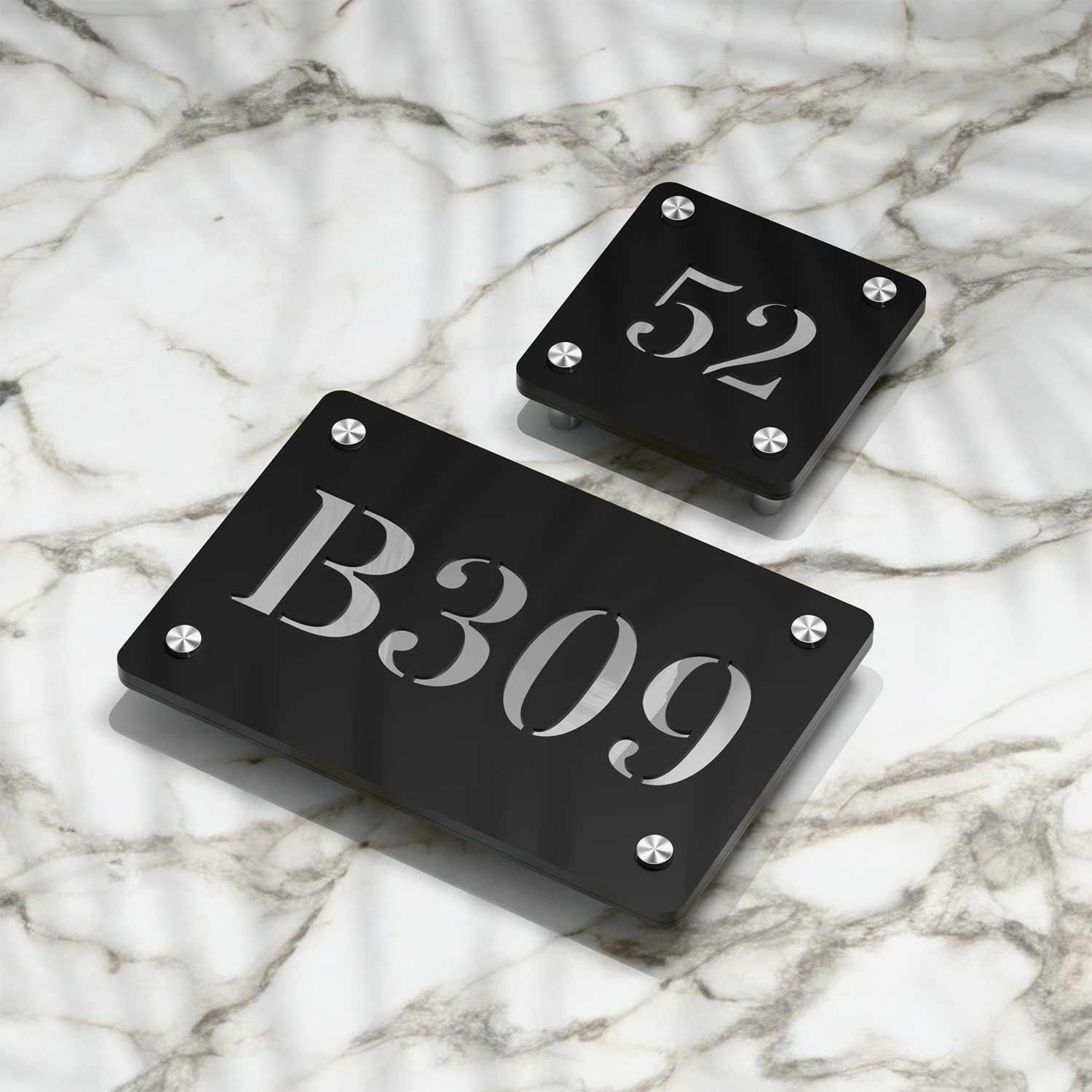 This number sign features a 5mm matte black acrylic top layer laser-cut to reveal the mirror silver Aluminium Composite Panel (ACP) sheet below. The result is a refined play of light and depth — matte and mirror finishes working in harmony to create a striking first impression.