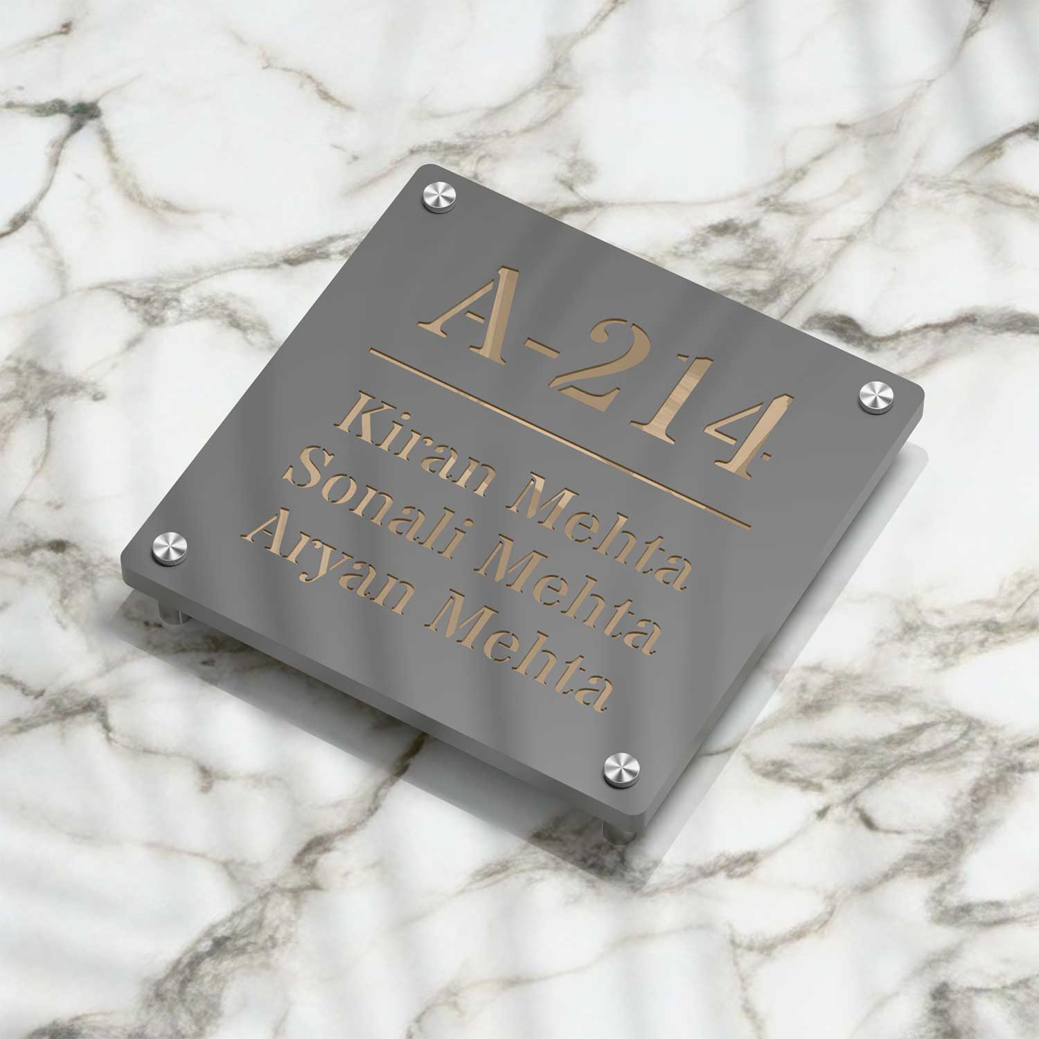 This nameplate features a 5mm matte dark grey acrylic top layer laser-cut to reveal the mirror gold Aluminium Composite Panel (ACP) sheet below. The result is a refined play of light and depth — matte and mirror finishes working in harmony to create a striking first impression.