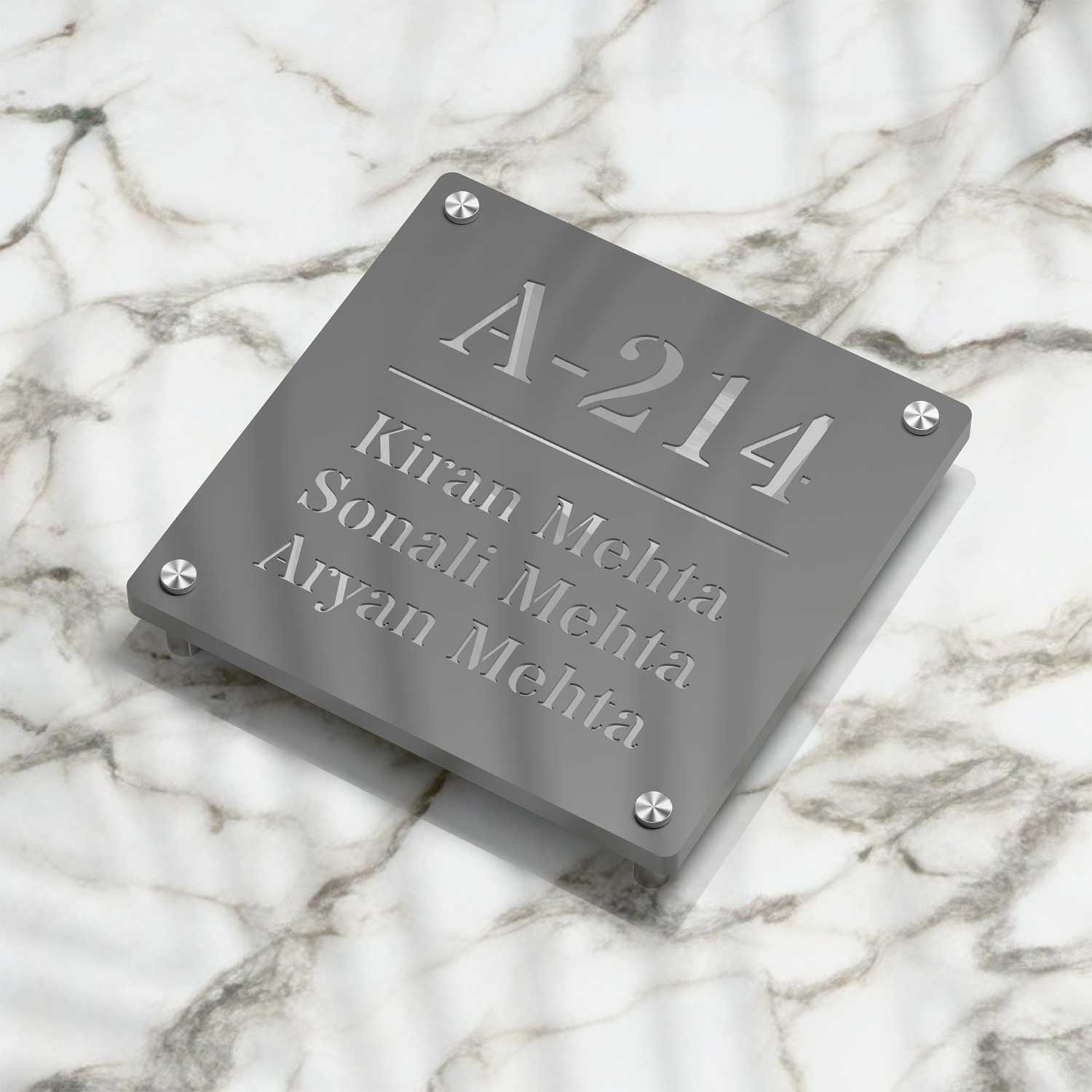 This nameplate features a 5mm matte dark grey acrylic top layer laser-cut to reveal the mirror silver Aluminium Composite Panel (ACP) sheet below. The result is a refined play of light and depth — matte and mirror finishes working in harmony to create a striking first impression.
