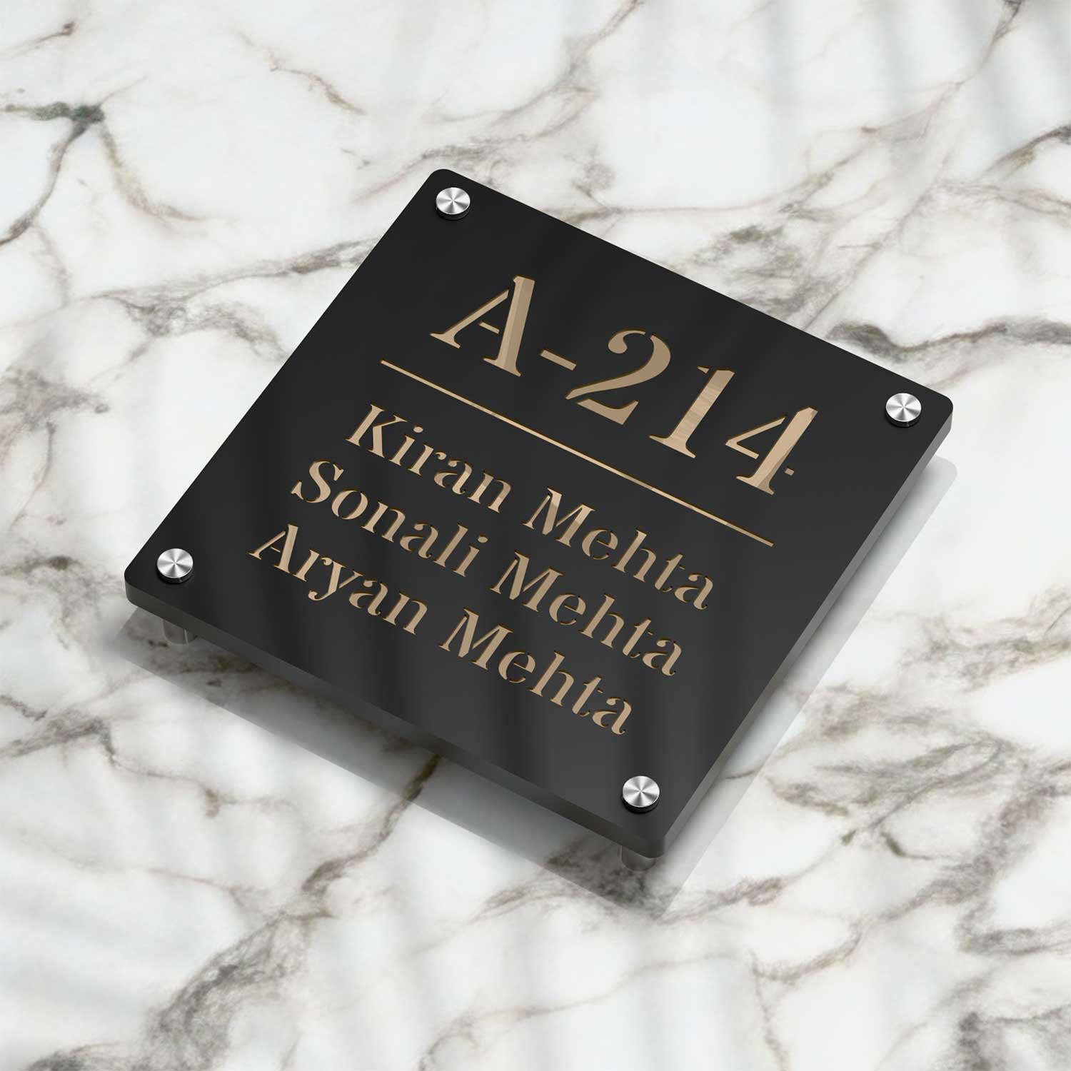 This nameplate features a 5mm matte black acrylic top layer laser-cut to reveal the mirror gold Aluminium Composite Panel (ACP) sheet below. The result is a refined play of light and depth — matte and mirror finishes working in harmony to create a striking first impression.