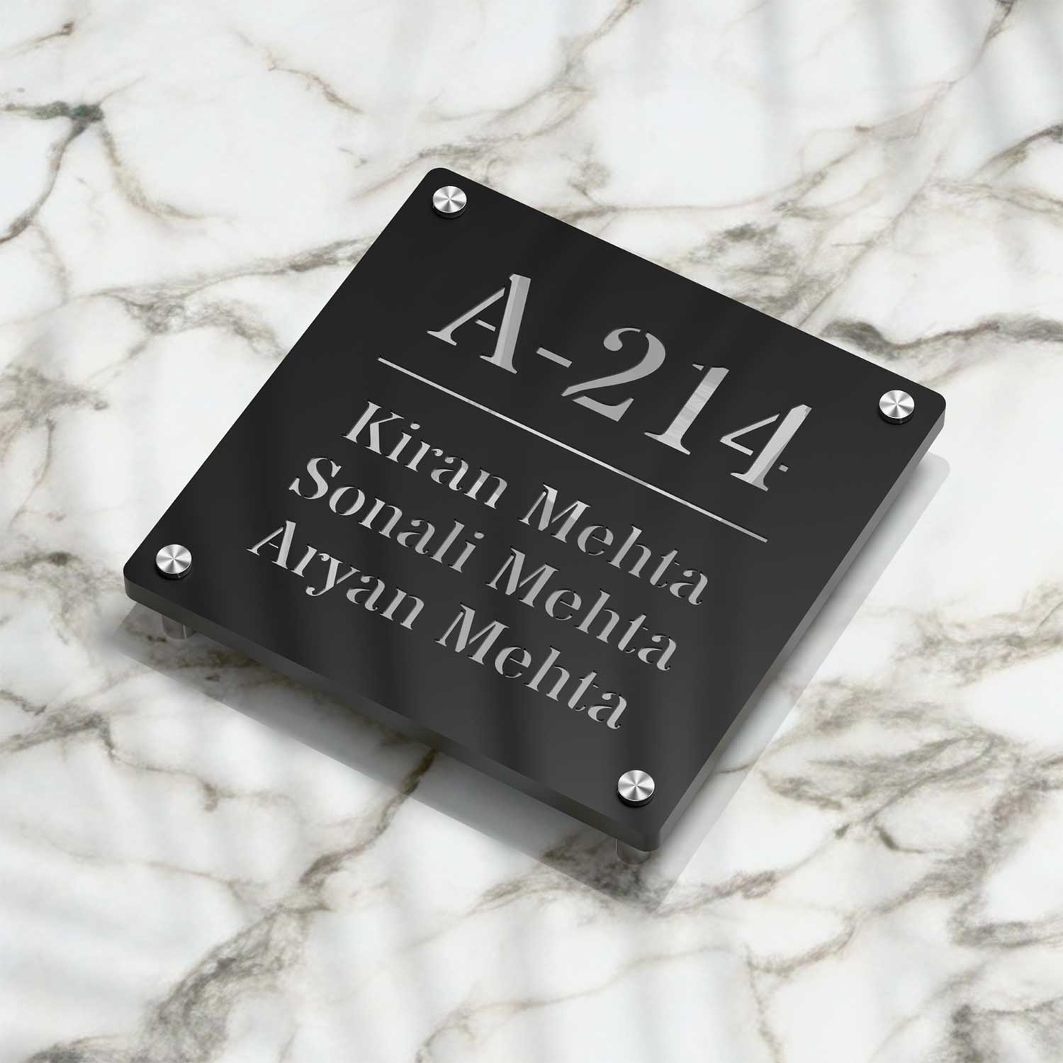 This nameplate features a 5mm matte black acrylic top layer laser-cut to reveal the mirror silver Aluminium Composite Panel (ACP) sheet below. The result is a refined play of light and depth — matte and mirror finishes working in harmony to create a striking first impression.