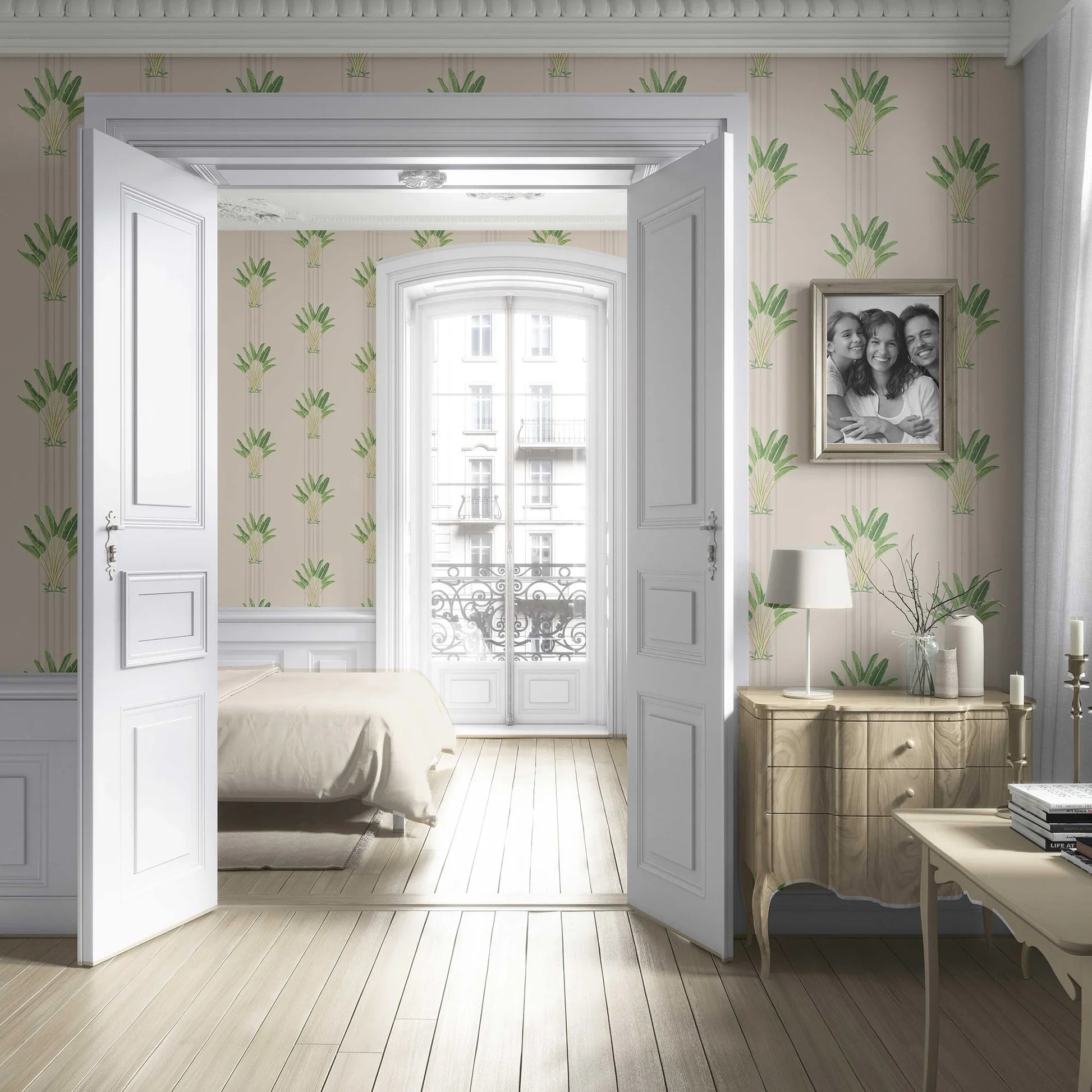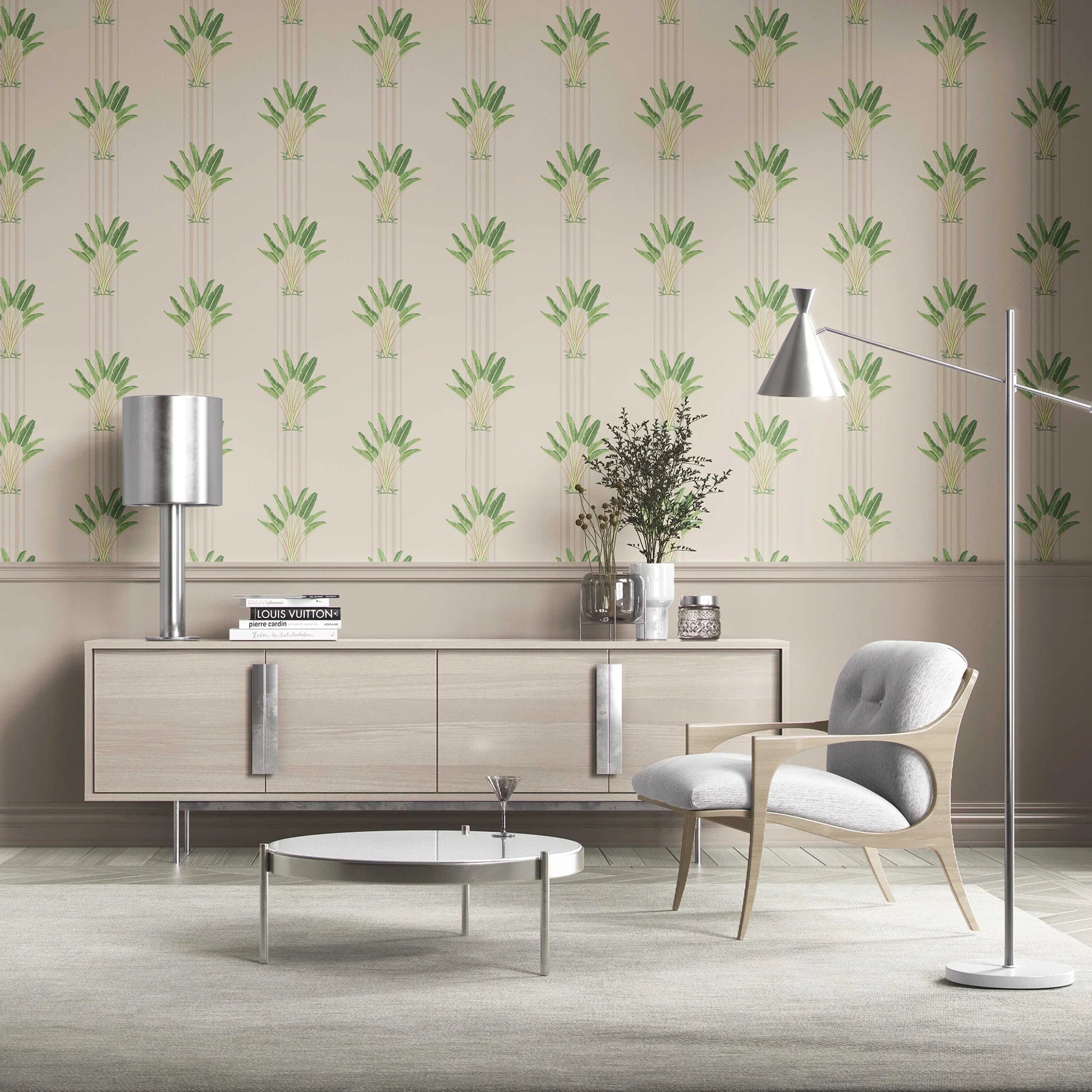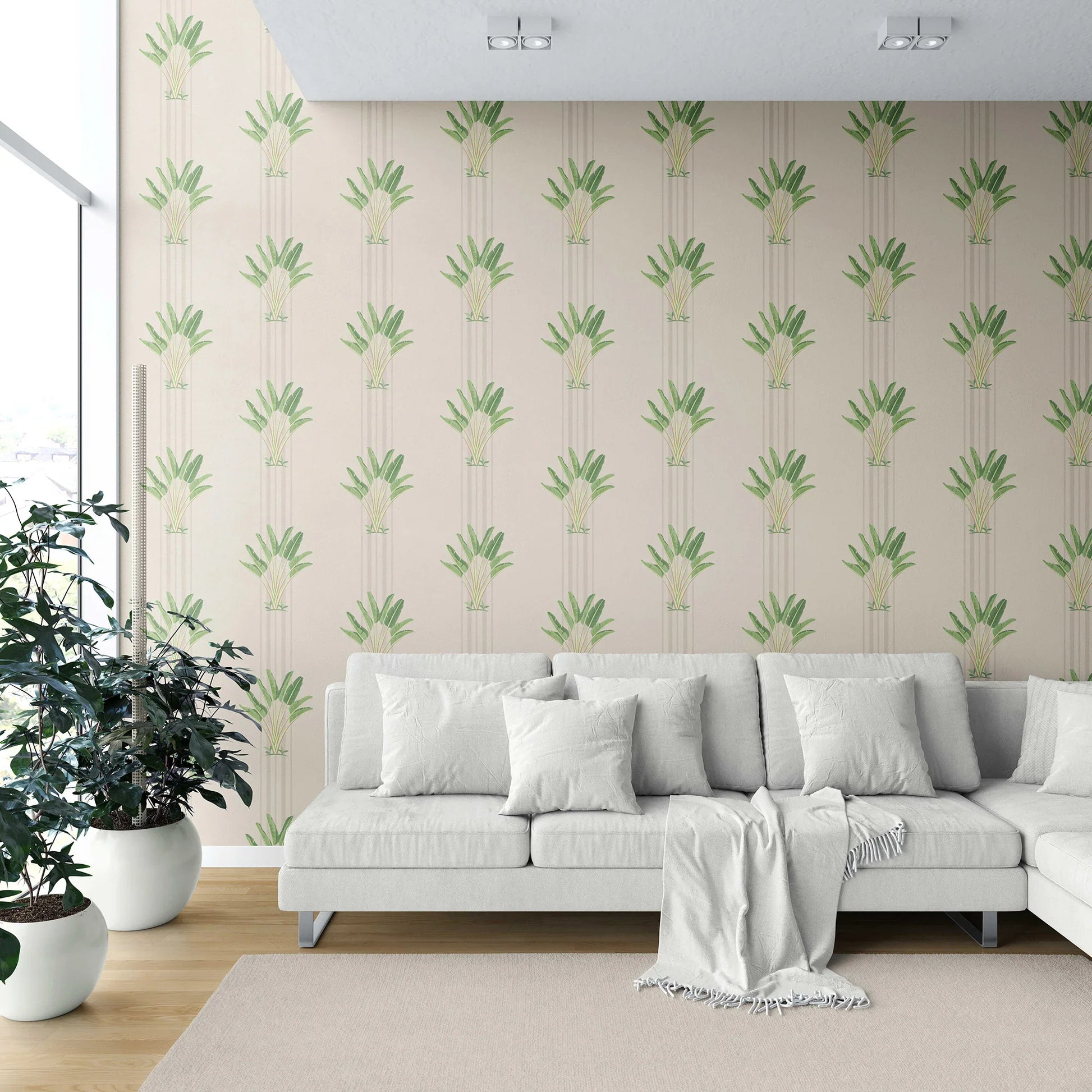 Bring the timeless elegance of Mughal-inspired gardens into your space with the Taalbagh Wallpaper. Featuring graceful palm motifs arranged in perfectly aligned columns, this design evokes the charm of royal courtyards and the symmetry of classical Indian architecture. The vertical lines add a sense of height and structure, while the lush green foliage brings a refreshing, natural touch to your interiors.