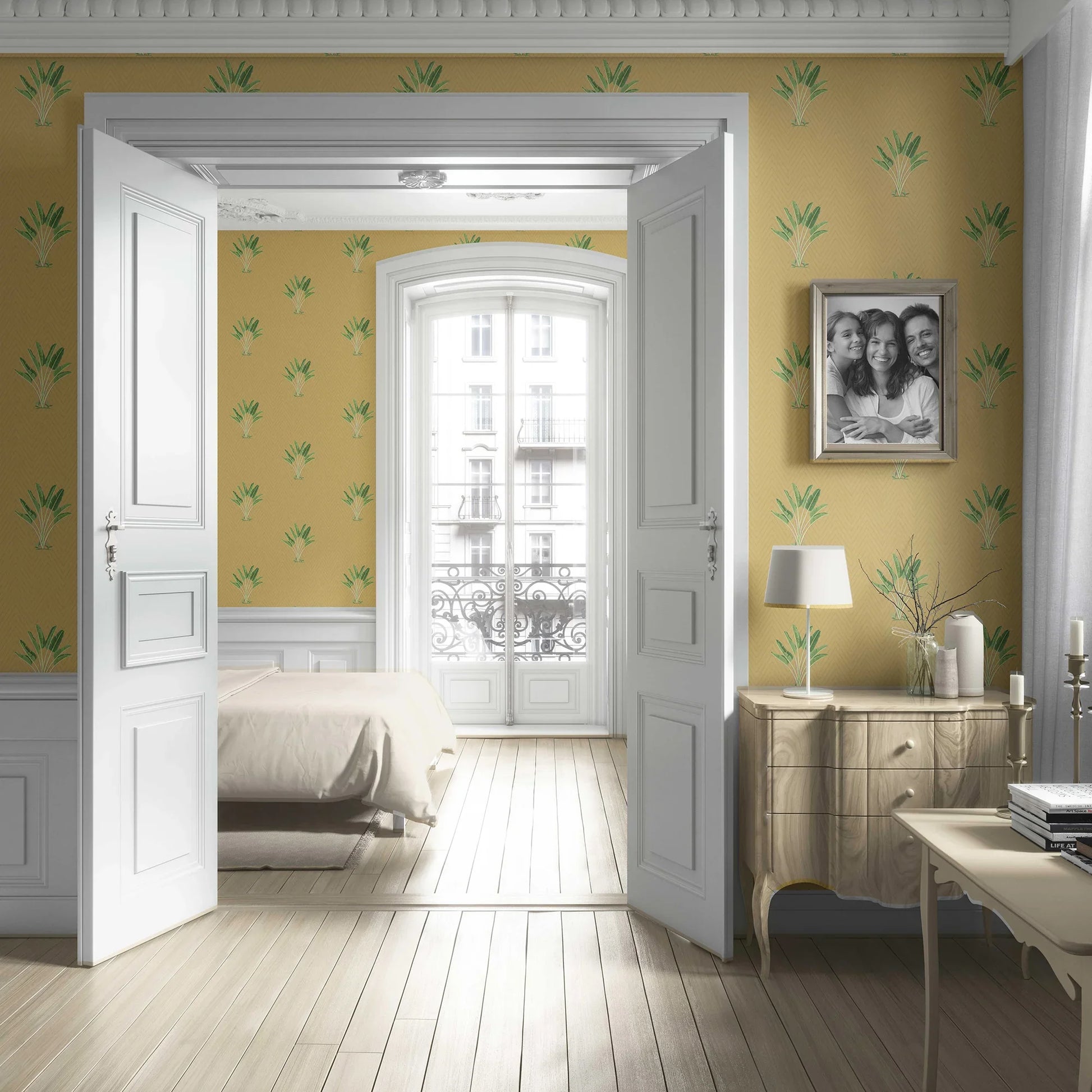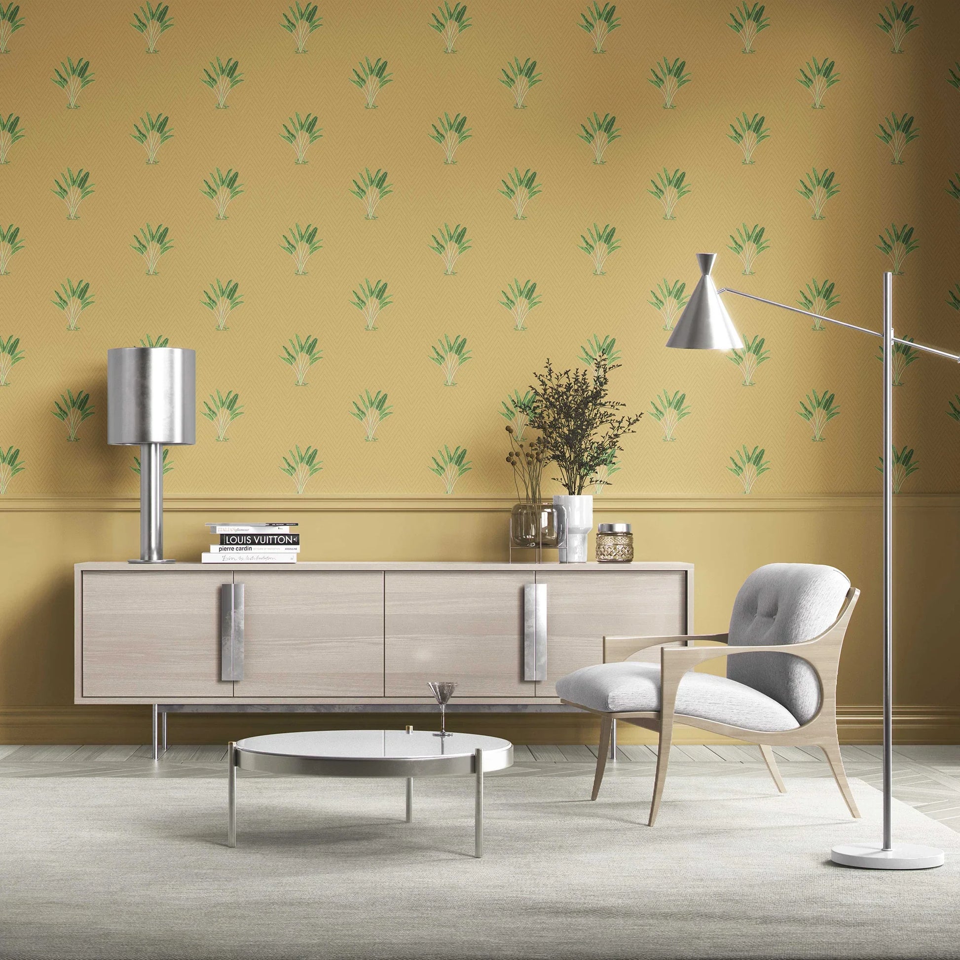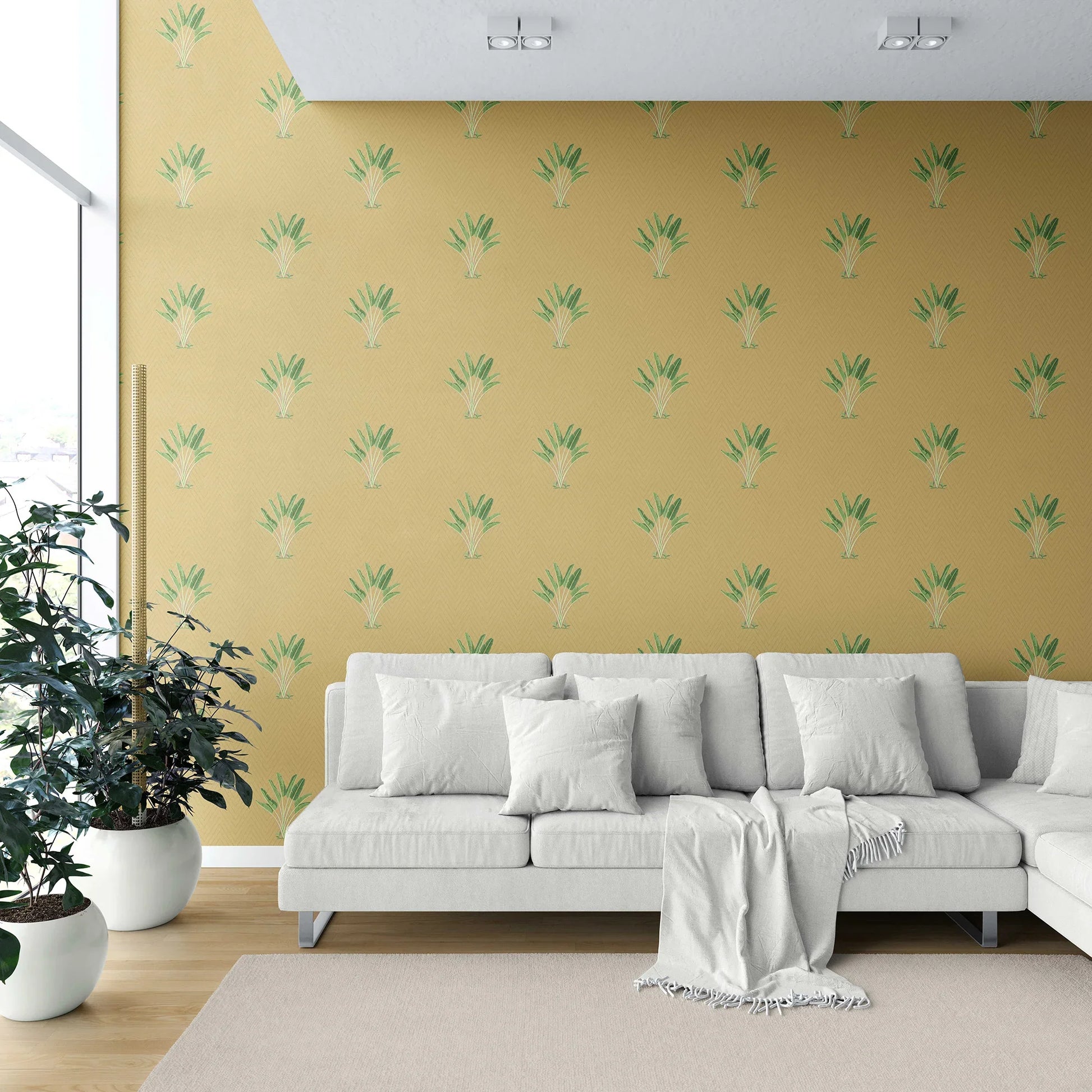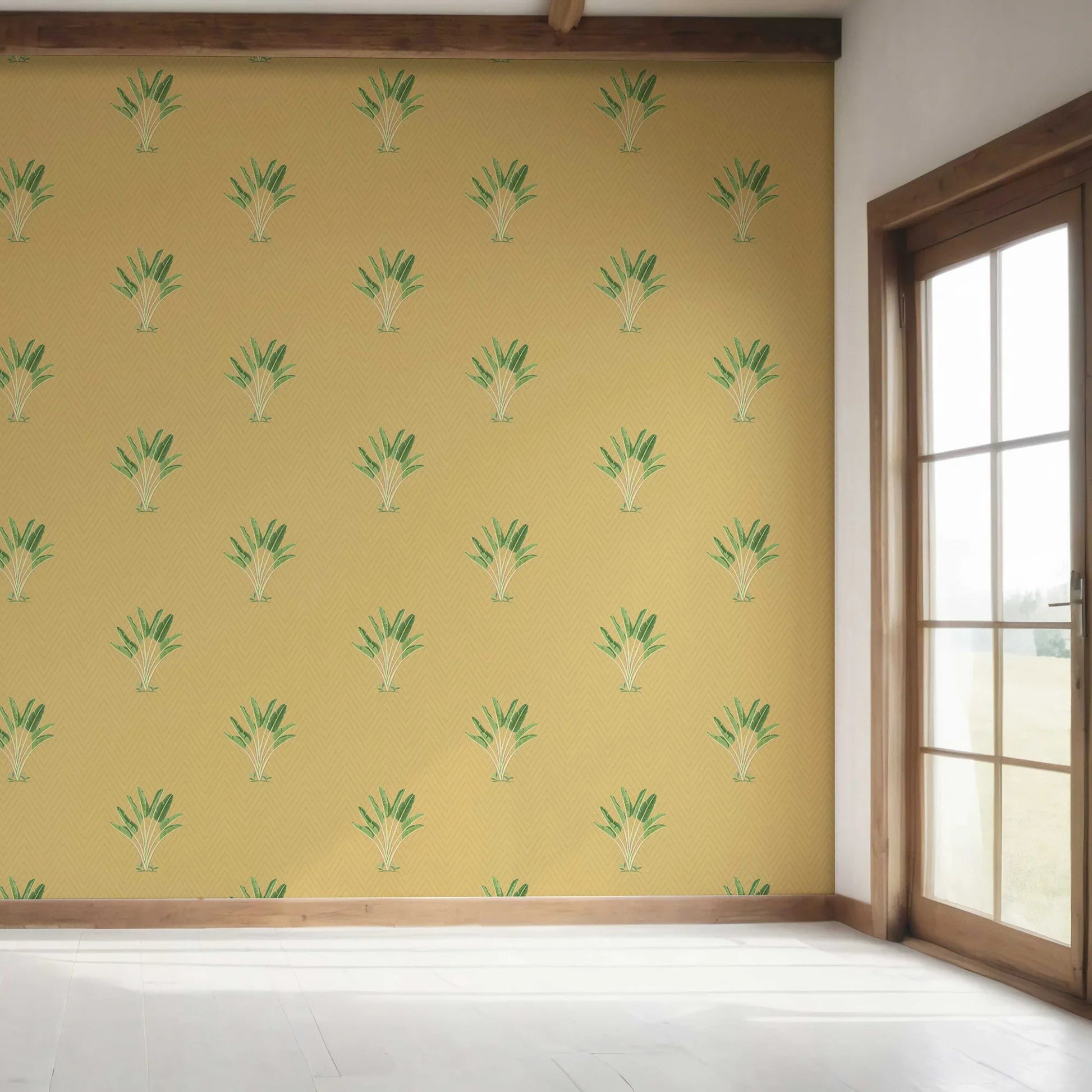 Bring home the timeless elegance of nature with the Taalpatra Wallpaper. Inspired by the graceful form of palm leaves (taal patra in Sanskrit), this design captures the harmony of the natural world and regal interiors. Each leaf cluster is delicately illustrated and set against a subtle chevron backdrop, creating a layered look that feels both refined and contemporary.