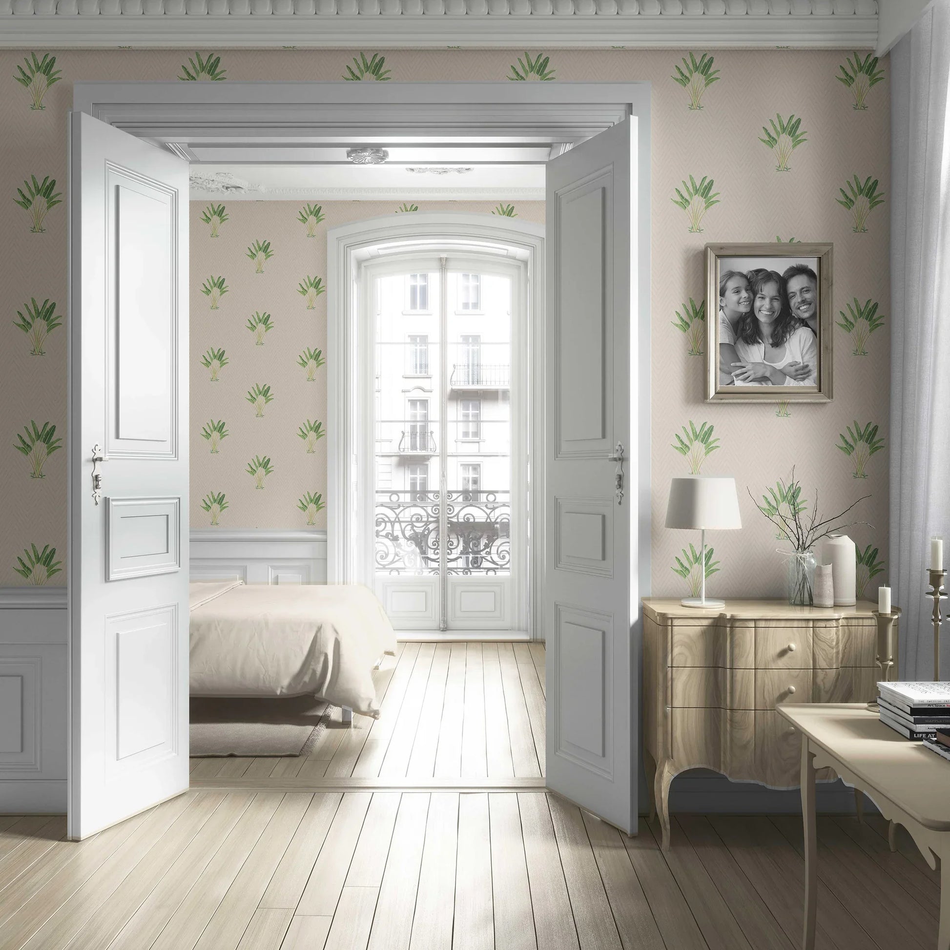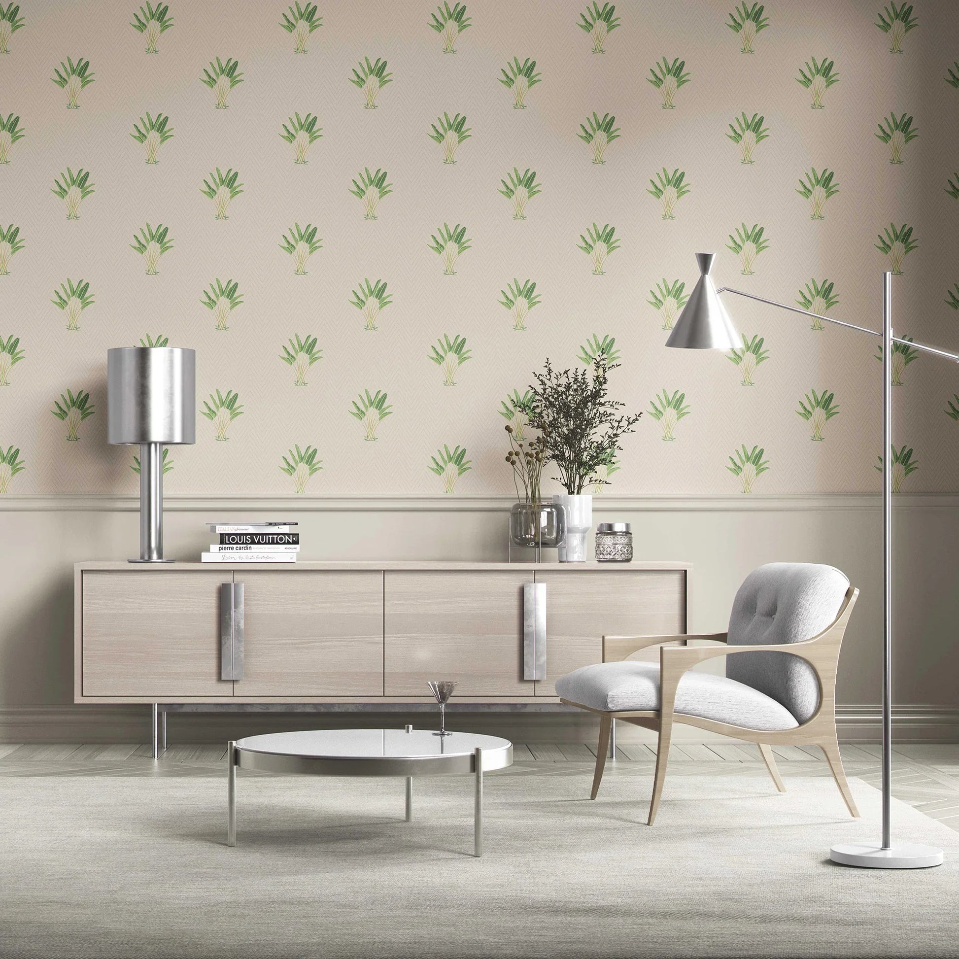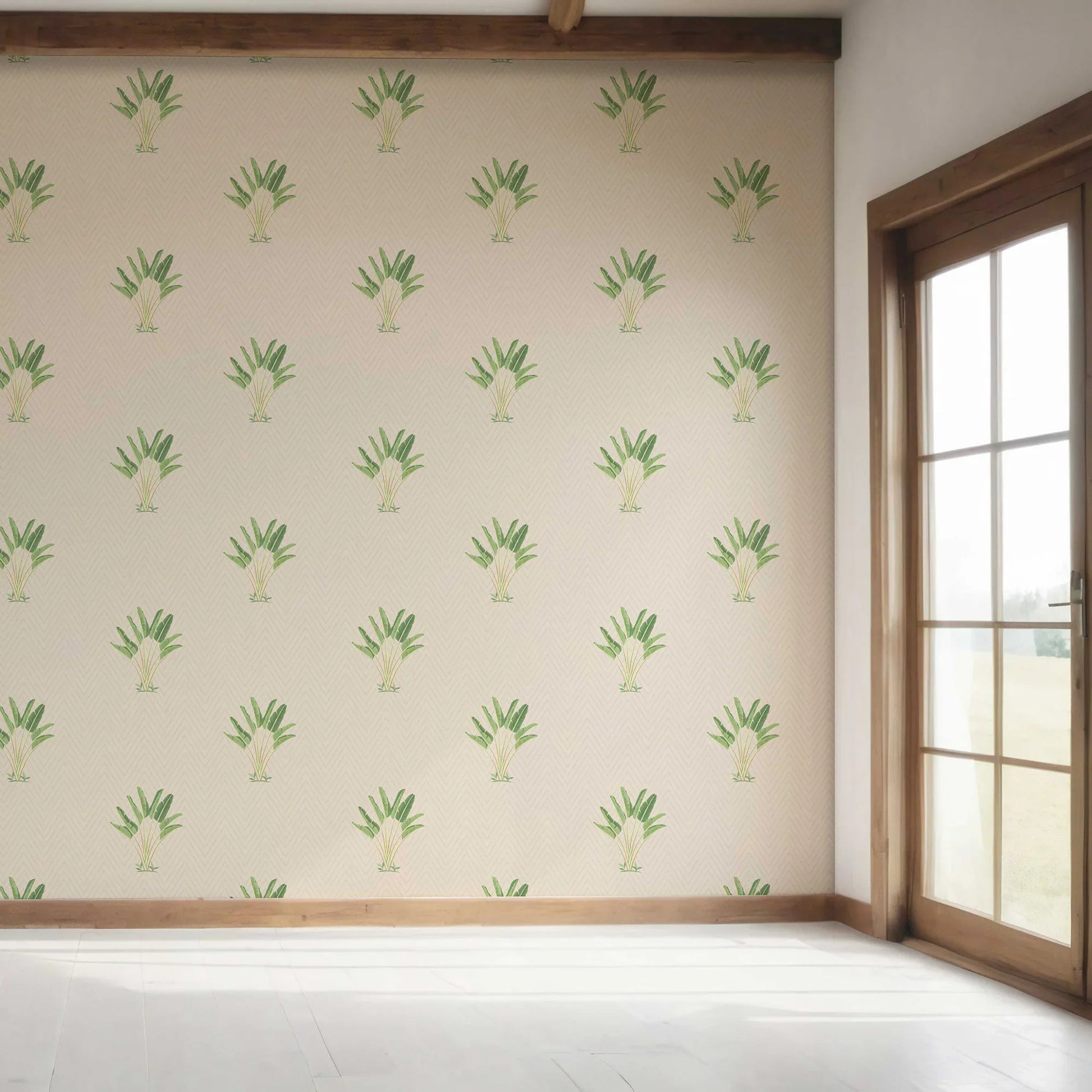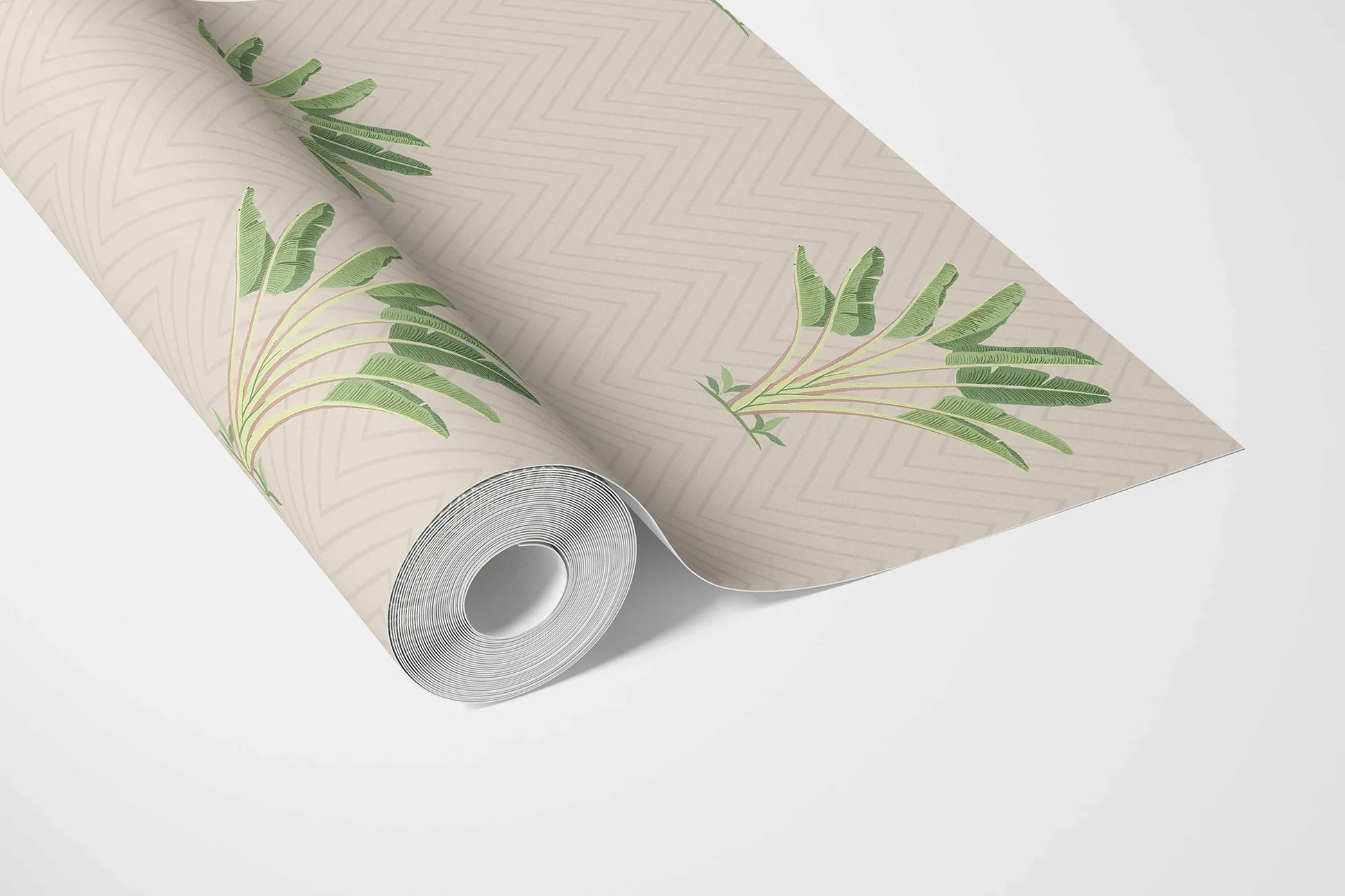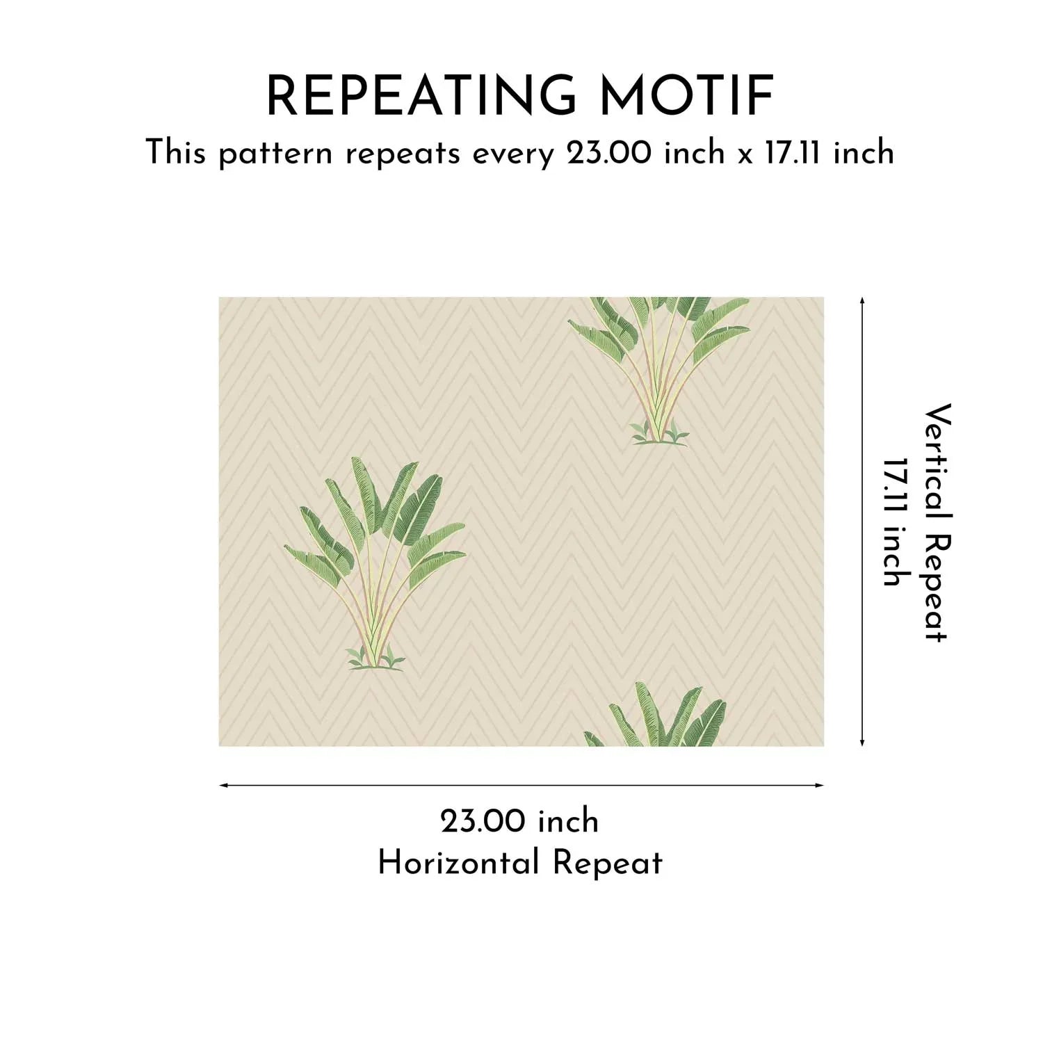 Bring home the timeless elegance of nature with the Taalpatra Wallpaper. Inspired by the graceful form of palm leaves (taal patra in Sanskrit), this design captures the harmony of the natural world and regal interiors. Each leaf cluster is delicately illustrated and set against a subtle chevron backdrop, creating a layered look that feels both refined and contemporary.