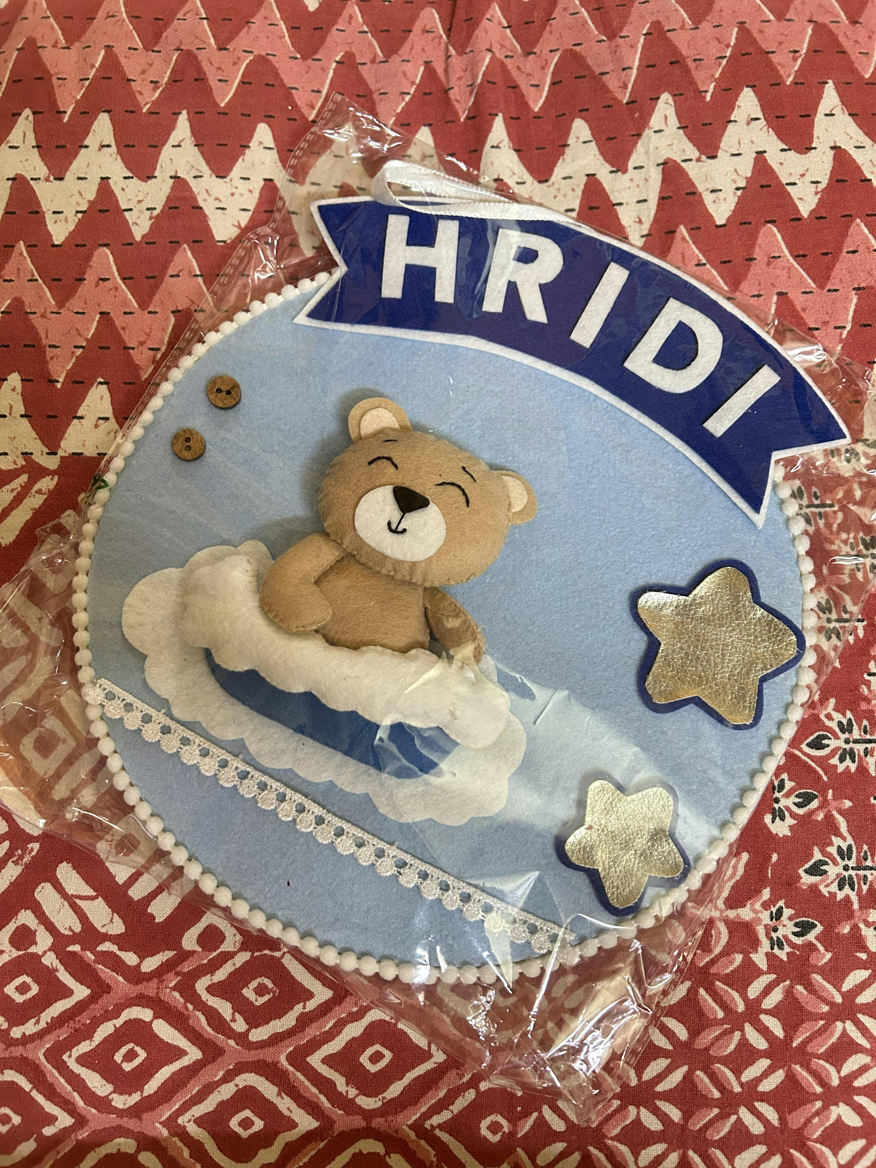 Add a charming touch to your little one’s room with this felt wall hanging showcasing a teddy resting on a cloud, customized with your child’s name. Ideal for nurseries, baby showers, or as a sweet Rakhi gift.